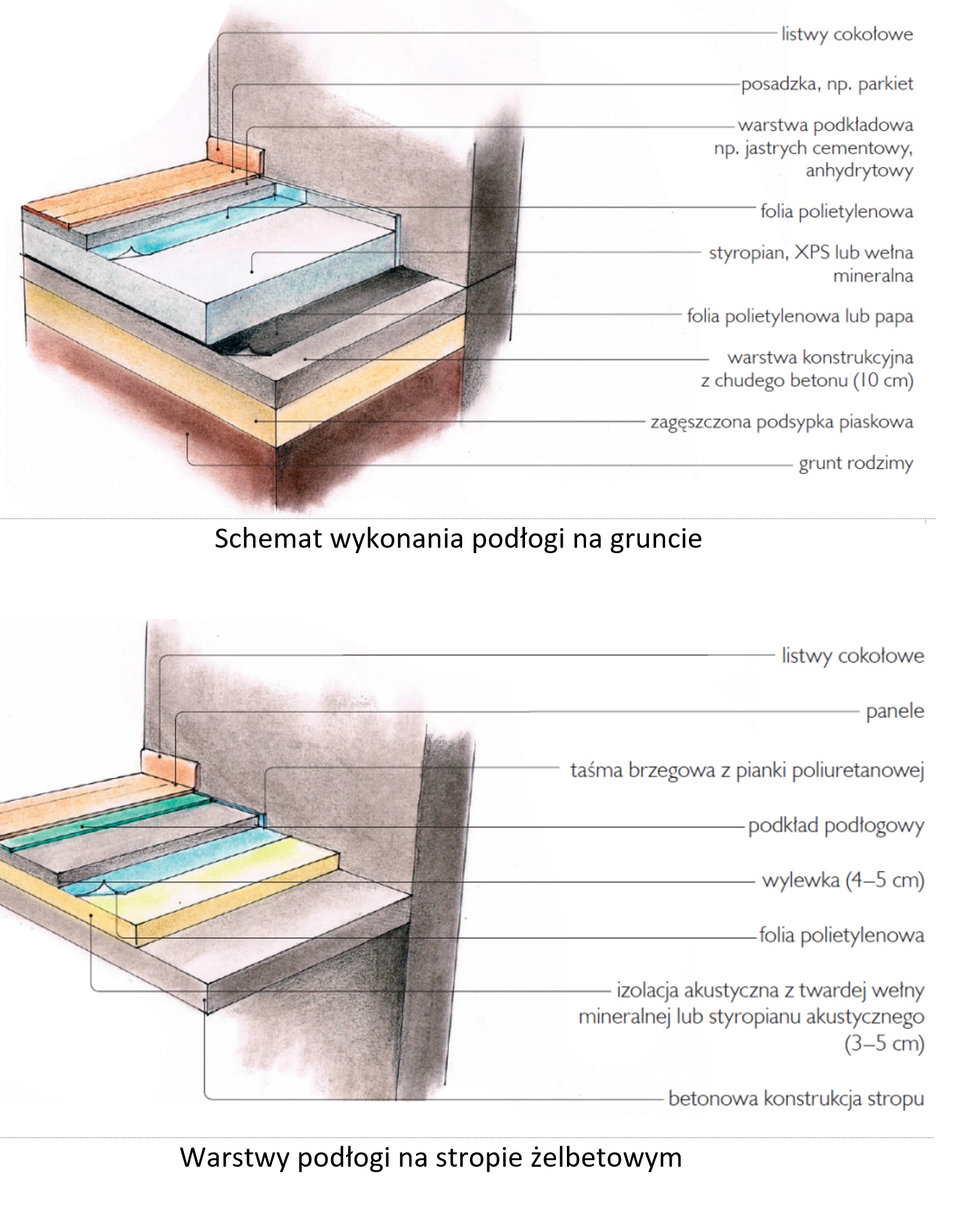 Oprócz przenoszenia obciążeń, musi skutecznie chronić przed ucieczką ciepła i przenikaniem wilgoci z gruntu. Schemat warstw podłogowych pokazano na rysunku.