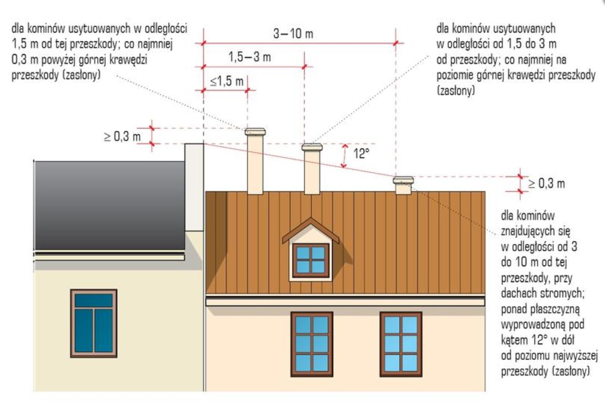 Górna krawędź komina powinna być wyprowadzona co najmniej 0,3m powyżej przszkodzy (ściany)
