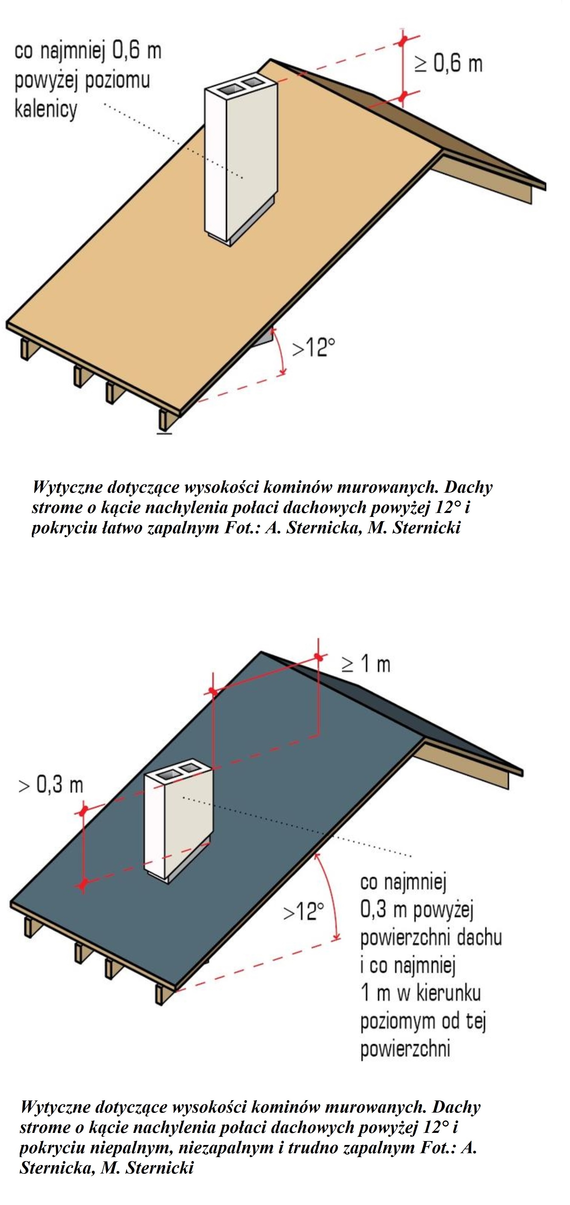 Wysokość komina nad kalenicą na pokryciu trudno zapalnym.
