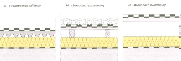 Umiejscowiona tu podłoga przenosi różne obciążenia, ale - w przeciwieństwie do tej na gruncie - nie musi chronić przed ucieczką ciepła, dlatego nie trzeba jej izolować termicznie. Nie dotyczy to stropów oddzielających pomieszczenia o różnej temperaturze, np. garaż i salon czy strych i piętro. W takich sytuacjach ocieplenie mocuje się od chłodniejszej strony.