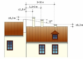 Wylot komina powinien więc znajdować się zależnie od nachylenia połaci dachowej: