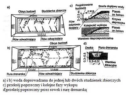 Wodę opadową płynącą po terenie w kierunku wykopu można przechwycić, stosując drenaż opaskowy w postaci rowów wypełnionym materiałem kamienistym lub gruboziarnistym, prowadzonych ze spadkiem poza rejon budowy. Wodę, która dostała się do wykopu, spompowuje się bezpośrednio z wykop przez ujęcie jej w obniżonym miejscowo fragmencie dna lub stosuje się system drenaży lub rowków, które sprowadzają je do studni zbiorczych.