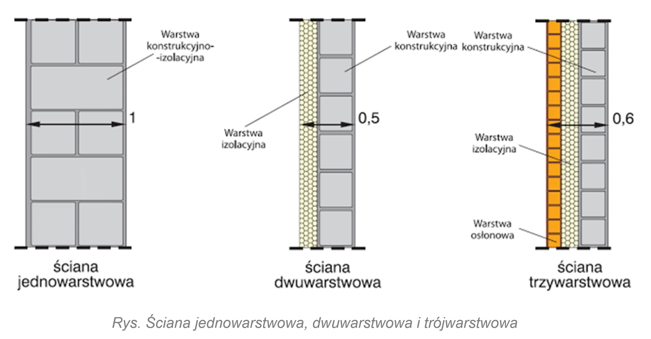 Ściany murowane zewnętrzne mogą być wznoszone w trzech technologiach: jedno-, dwu- i trójwarstwowej.