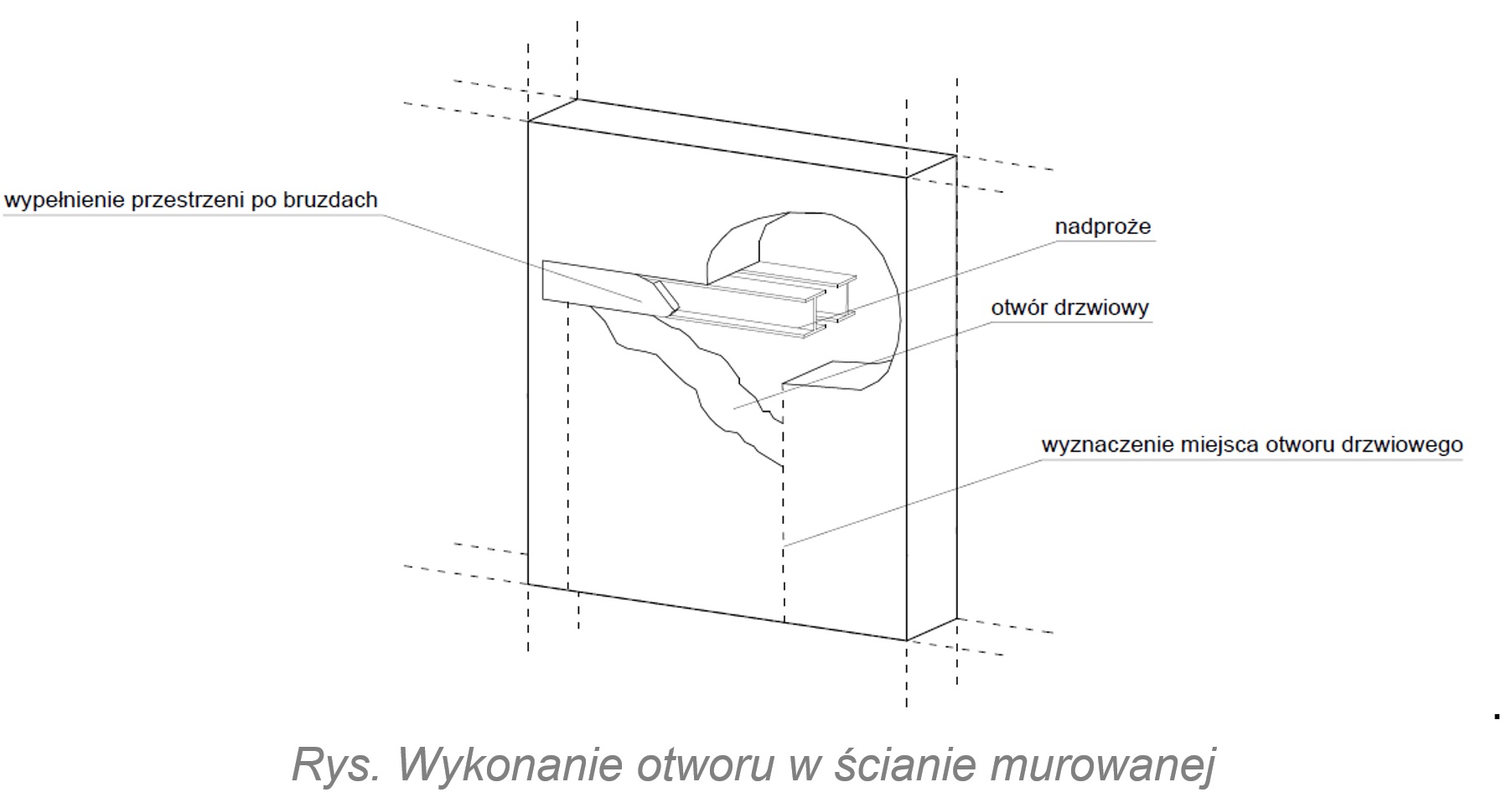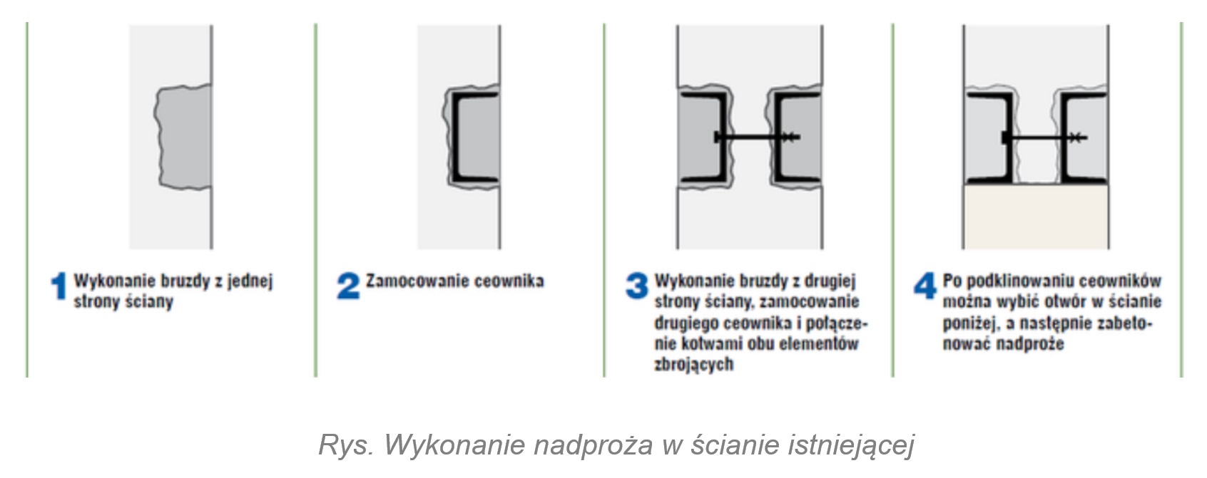 W celu wykonania stalowego nadproża należy wyciąć bruzdy poziome o głębokości minimum 1,2 razy głębszej od szerokości stopki montowanej belki stalowej nie głębszej jednak niż połowa grubości ściany.