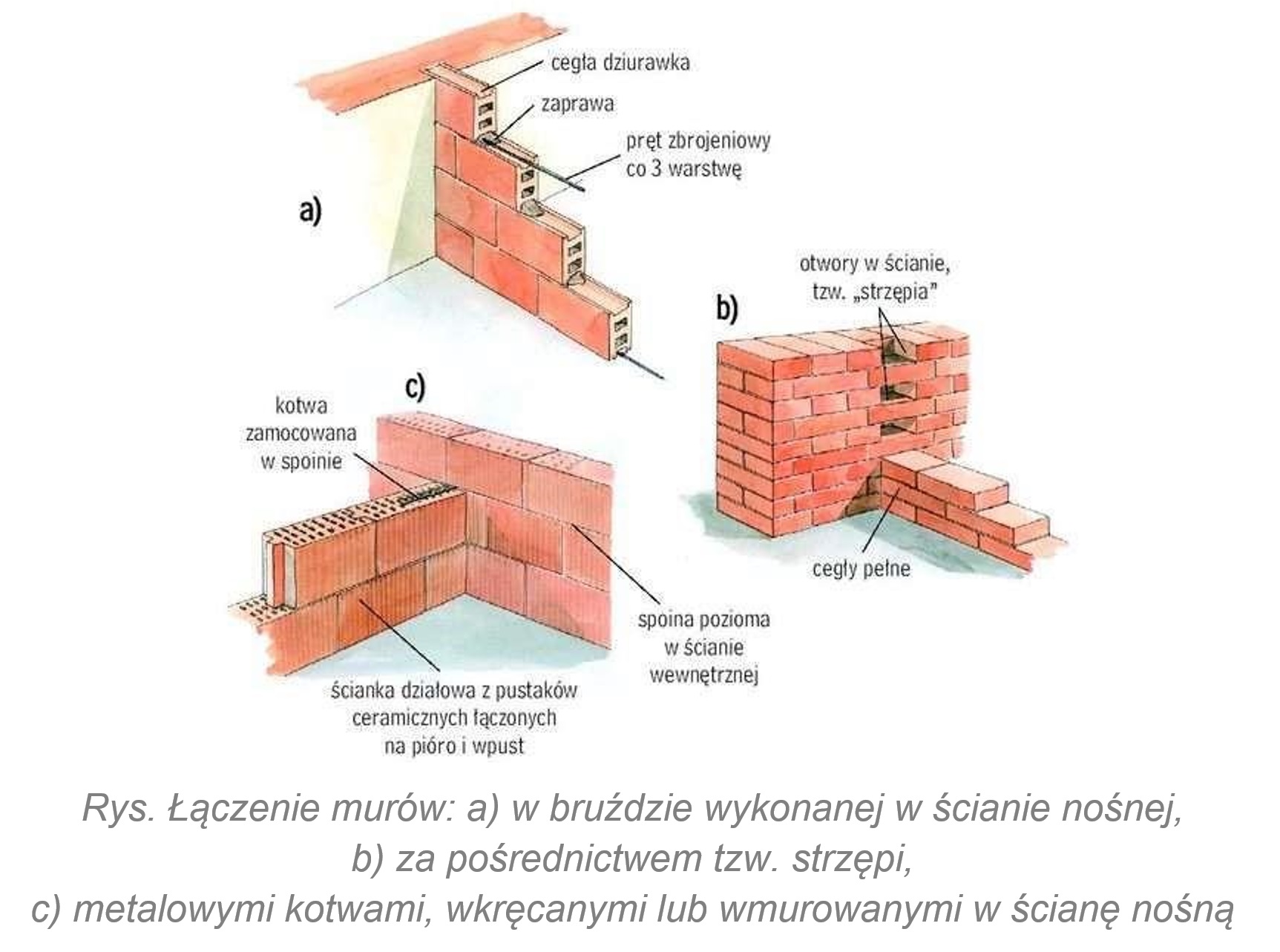 Wygodnym sposobem łączenia są kotwy metalowe, mocowane kołkami rozporowymi do ściany nośnej i wpuszczone w spoiny ścianki działowej na długości 10-15 cm. Jednak nie jest to połączenie zbyt sztywne, dlatego w narożniku często pojawiają się pęknięcia.