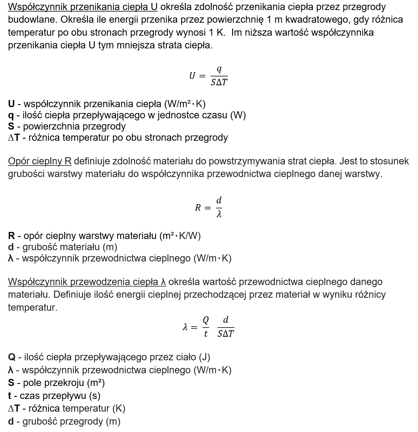 Omówić współczynnik przenikania ciepła U, opór cieplny R i współczynnik przewodzenia ciepła (lambda).