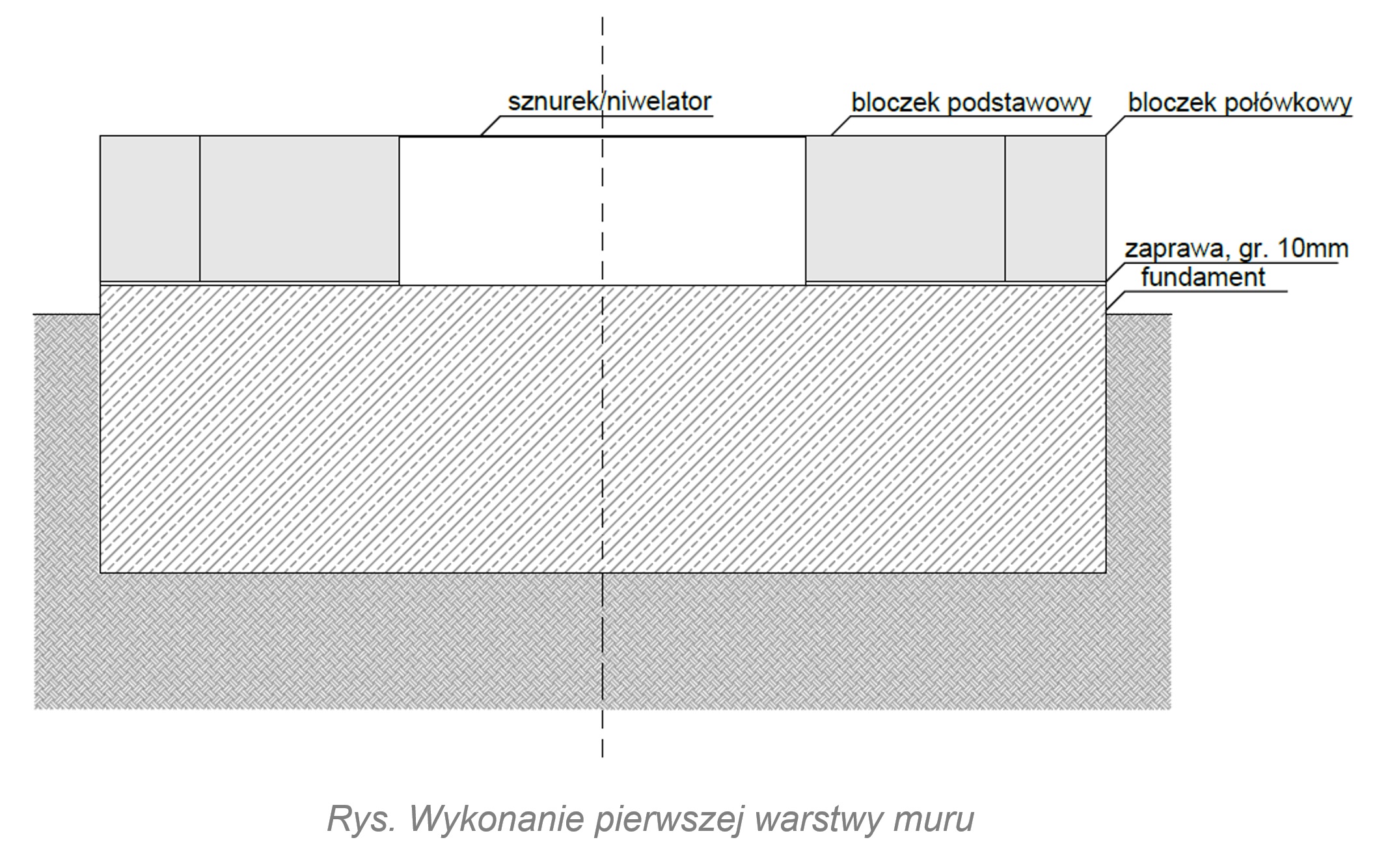 Po ustabilizowaniu wszystkich bloczków narożnych należy rozciągnąć pomiędzy nimi sznur murarski i uzupełnić warstwę. Podczas uzupełniania pierwszej warstwy należy dokładnie kontrolować poziomicą wysokość i poziom górnej płaszczyzny układanych bloczków. Korekty położenia należy dokonywać młotkiem gumowym. Dla co dziesiątego bloczka zaleca się przeprowadzenie kontrolnego pomiaru niwelatorem.