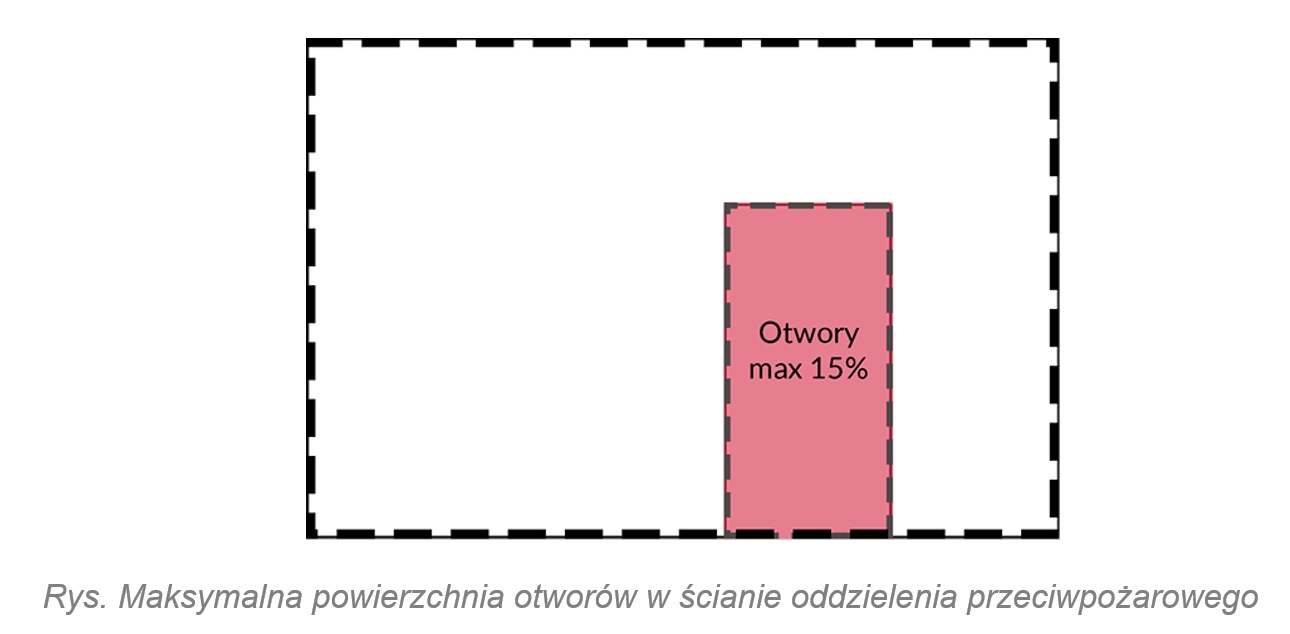 Maksymalna powierzchnia otworów w ścianie oddzielenia przeciwpożarowego wynosi łącznie 15% powierzchni tej ściany, nie stosuje się tego ograniczania w ścianach oddzielenia przeciwpożarowego znajdujących się na drodze manewrowej w garażu. Jeżeli otwory występują w stropie oddzielenia przeciwpożarowego, łączna powierzania otworów nie może przekraczać 0,5% powierzchni tego stropu.