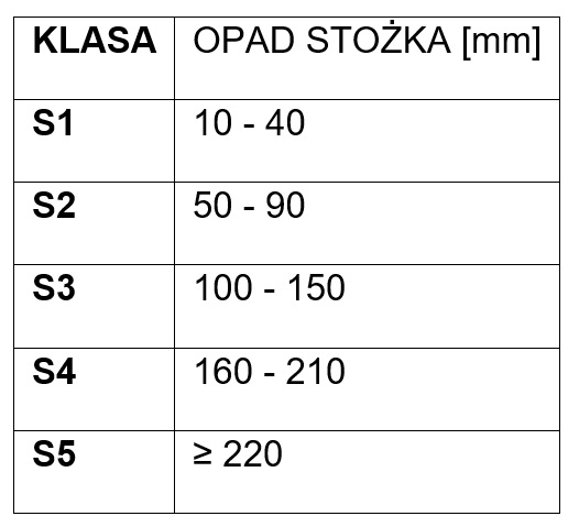 Na tej podstawie wyróżniamy klasy konsystencji według metody opadu stożka: