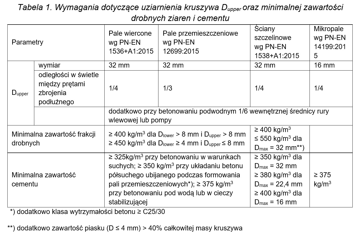 Kruszywa. Zaleca się stosowanie kruszyw otoczakowych o ciągłym uziarnieniu. Dopuszcza się kruszywa z recyklingu lub kruszywa porowate, ale należy w tym przypadku uważać na zmiany konsystencji w czasie. Odnośnie do uziarnienia należy określić najmniejszy wymiar kruszywa Dlower i największy Dupper, który nie może przekraczać najmniejszej z podanych wartości w przypadku poszczególnego zastosowania (tabela 1).