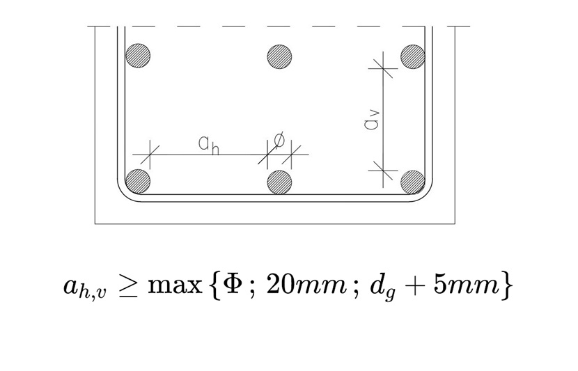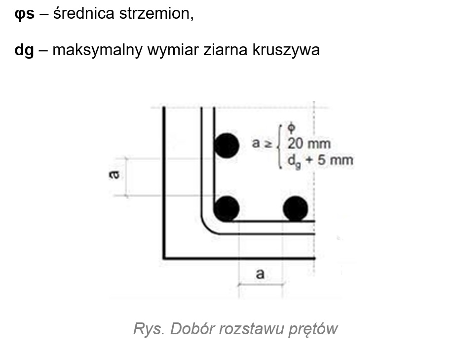 Rozstaw prętów w przekroju powinien umożliwiać należyte ułożenie mieszanki betonowej bez segregacji składników, przy zapewnieniu właściwych warunków przyczepności zbrojenia do betonu. Podstawową zasadę rozmieszczania zbrojenia według norm pokazano na rysunku poniżej.