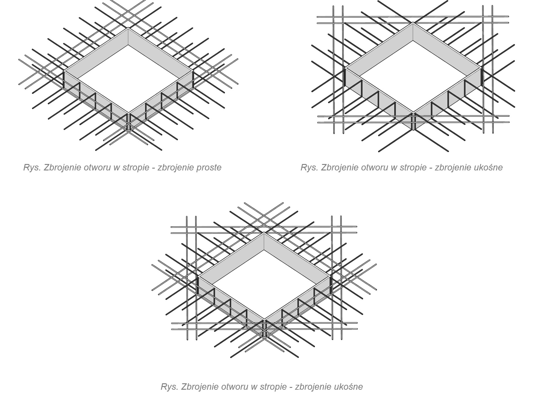 Zbrojenie wokół otworu zależne jest od schematu zbrojenia głównego, wielkości otworu oraz grubości płyty stropowej. Główne założenia, podczas projektowania zbrojenia wokół otworu w stropie:
