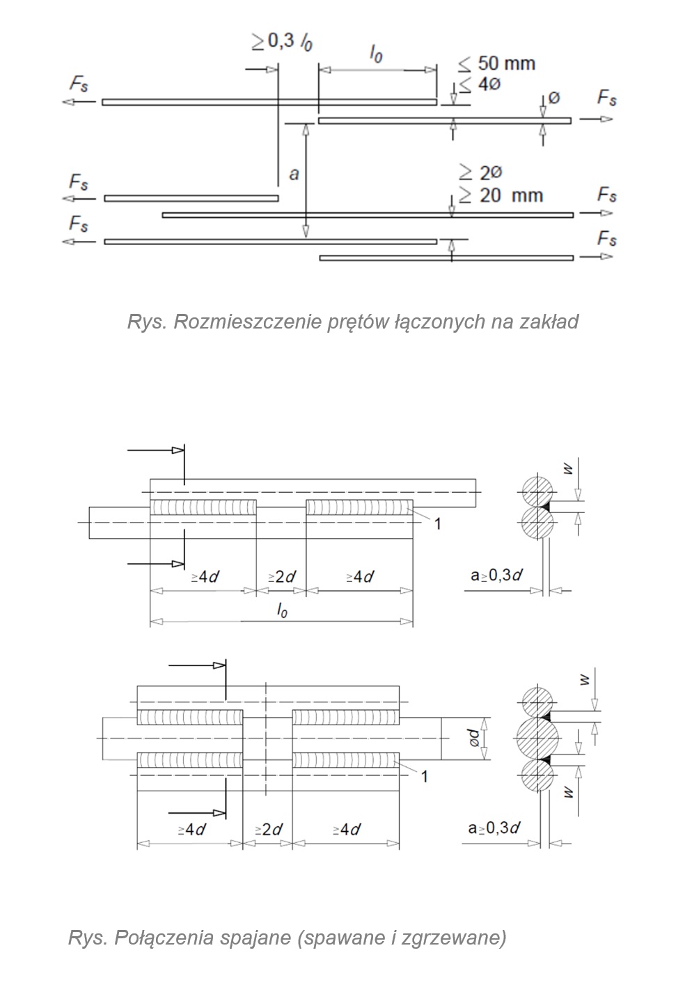 Odległość w świetle między prętami łączonymi na zakład powinna być nie większa niż 4fi i 50 mm, w przeciwnym razie długość zakładu należy zwiększyć o długość równą odległości w świetle między prętami. Mierzona wzdłuż prętów odległość między dwoma sąsiednimi zakładami powinna być nie mniejsza niż 0,3 długości zakładu Lo.