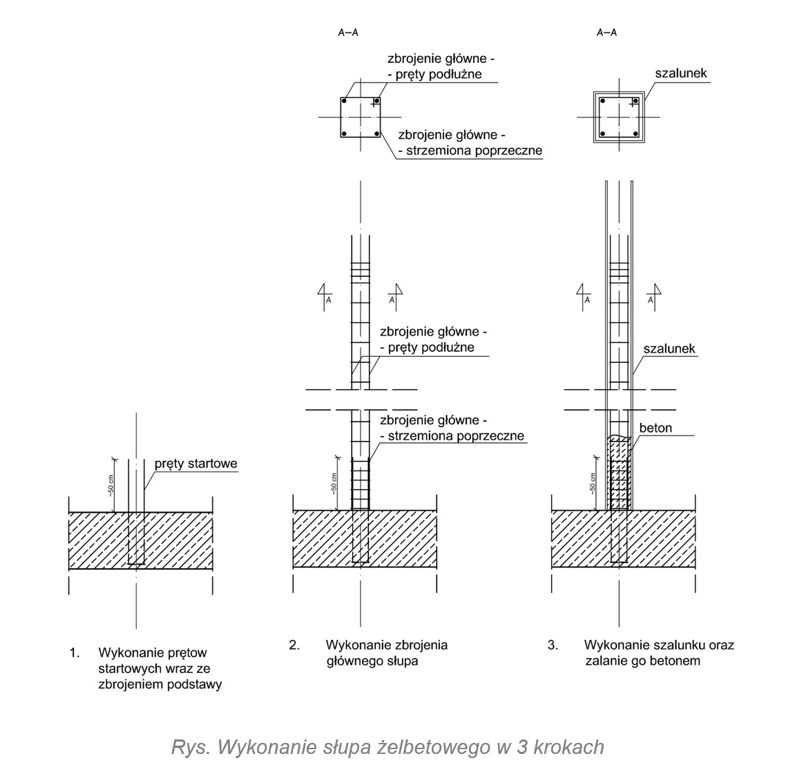 Pierwszym etapem budowy słupa jest wykonanie prętów startowych wraz ze zbrojeniem np. stopy fundamentowej. Pręty te wystają z betonu na odpowiednią długość (zazwyczaj około 50 cm), co pozwala na dobre połączenie słupa z jego podstawą. Jeżeli słup zaczyna się na poziomie fundamentów to należy pamiętać o jego odpowiednim zaizolowaniu.