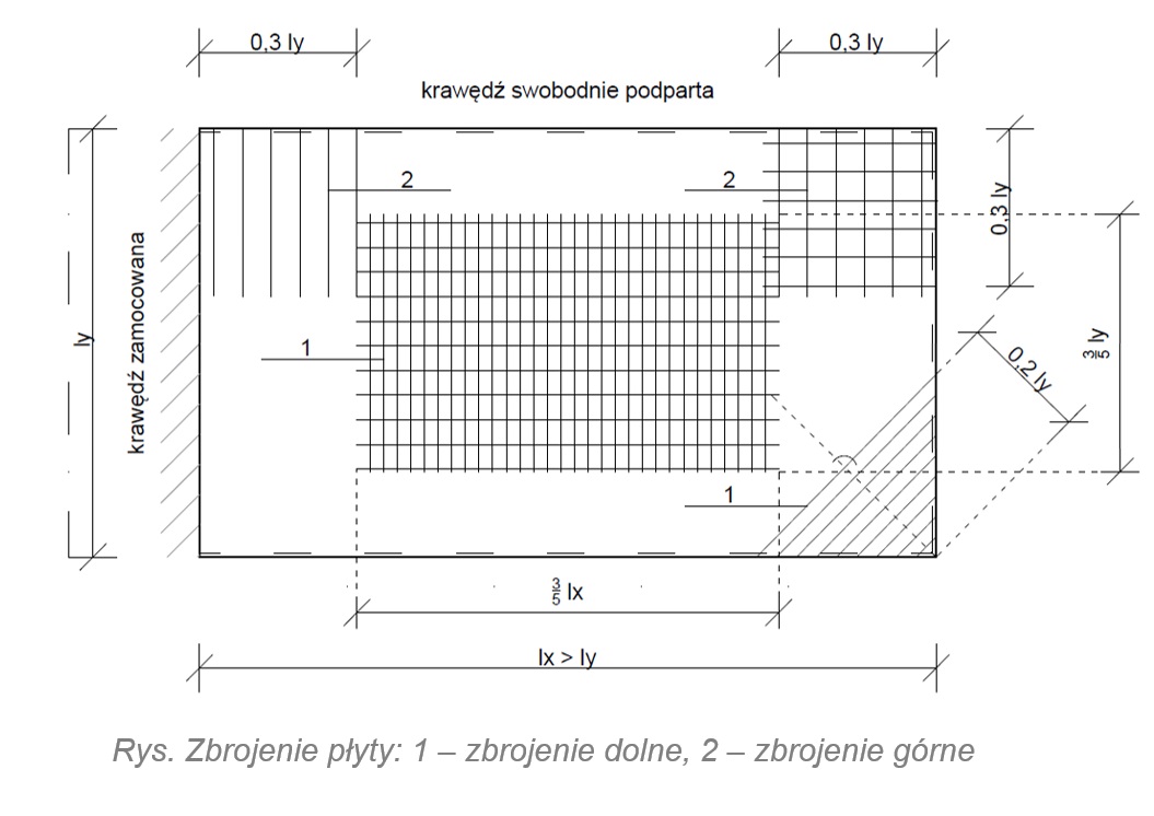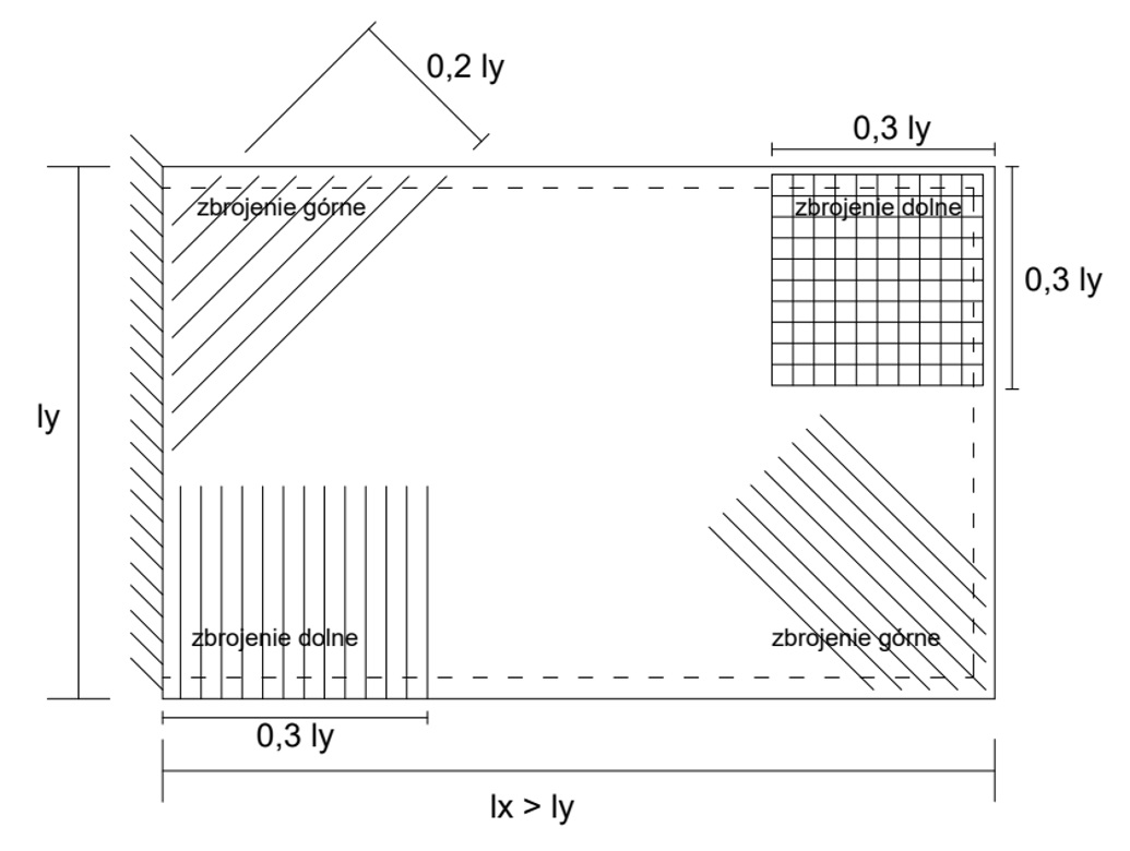 W narożach wolno podpartych należy umieszczać dwukierunkowe zbrojenie górne, równoległe do krawędzi, na szerokości równej 0,3 mniejszej rozpiętości. Przekrój tego zbrojenia na jednostkę szerokości przekroju płyty powinien wynosić w każdym kierunku co najmniej połowę przekroju większego zbrojenia znajdującego się w środku płyty.