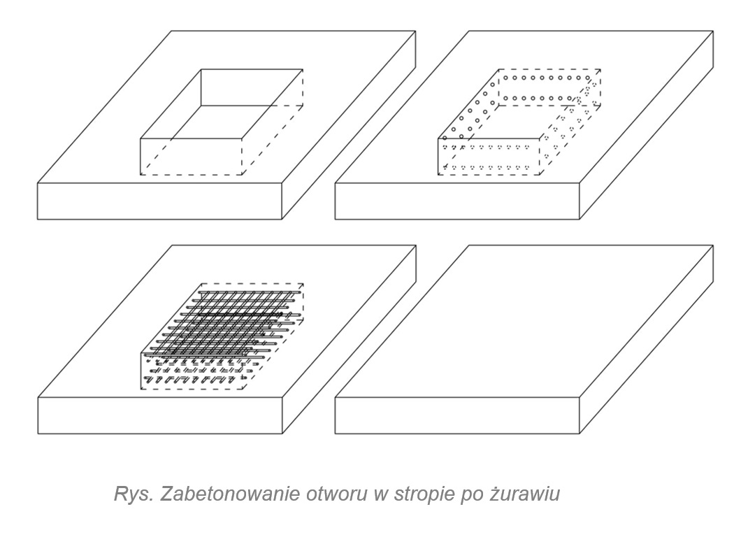 Opisać sposób zabetonowania otworu w stropie po żurawiu - dolewanie stropu żelbetowego.