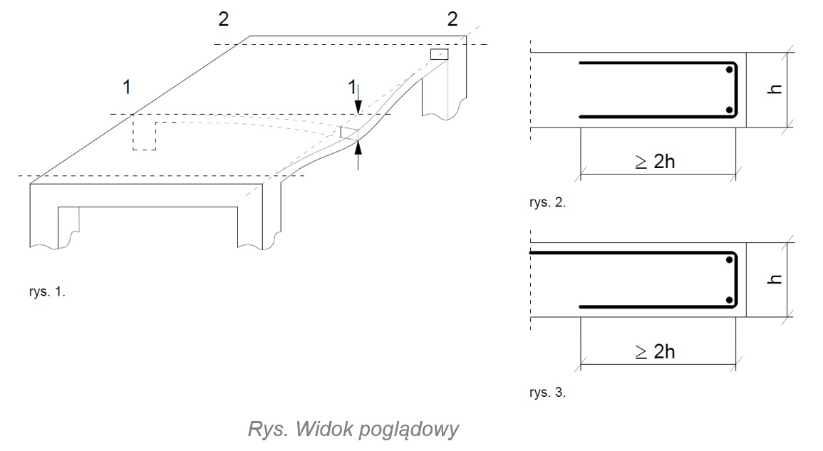 W takim wypadku powinno występować krawędziowe zbrojenie podłużne i poprzeczne układane wzdłuż swobodnych (niepodpartych) krawędzi. Najczęściej stosuje się zbrojenie wyglądające jak na rysunku (rys.2). Niekiedy występuje zbrojenie zwykłe, które zagięte w odpowiedni sposób pełni rolę poprzecznego zbrojenia krawędziowego.