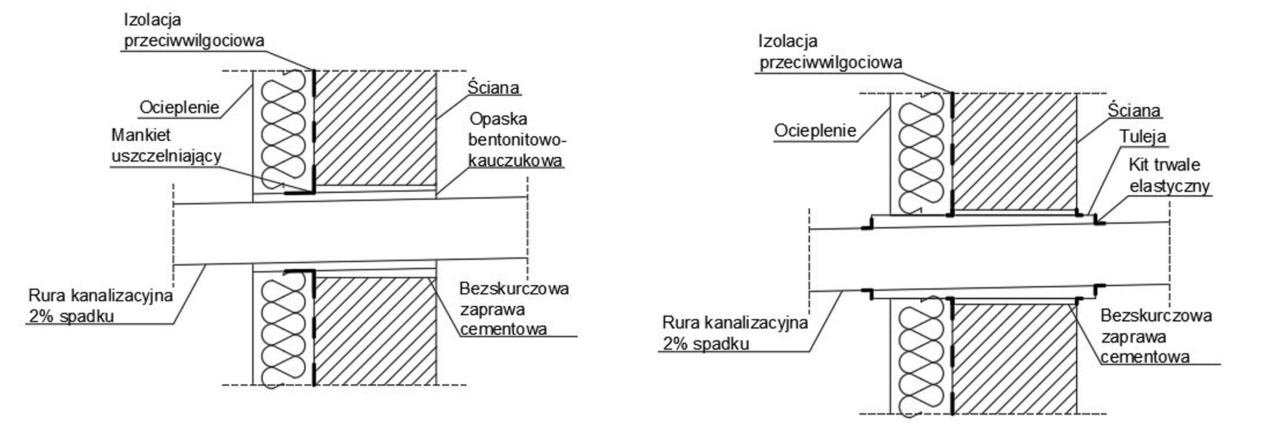 Przejście rury przez ścianę powinno być elastyczne, aby uniknąć pęknięcia przewodu podczas pracy rurociągu przy osiadaniu budynku i Szczelne, żeby zapobiec zamakaniu ścian fundamentowych przez wody gruntowe albo opadowe.