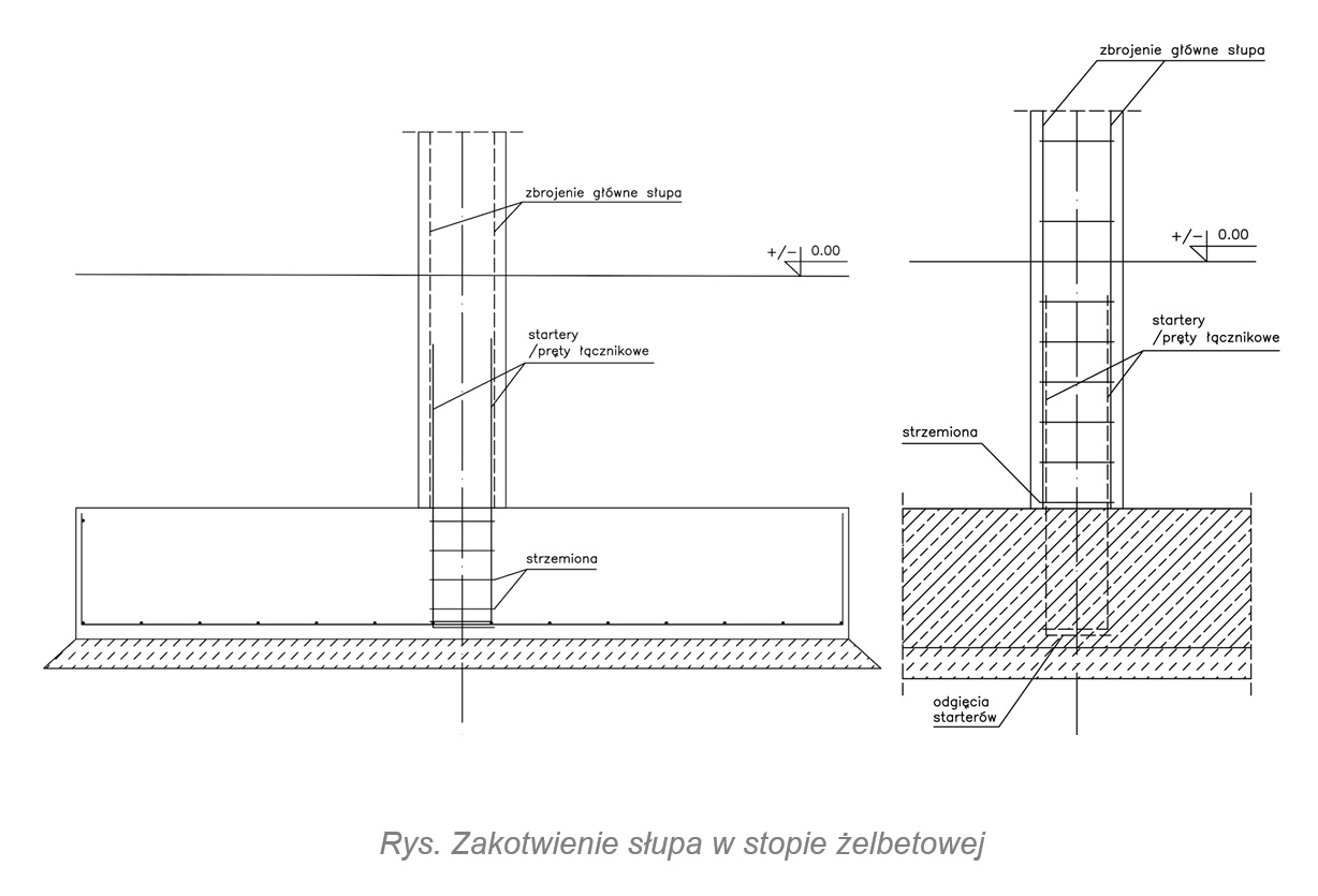 Dla słupa żelbetowego - na połączeniu podstawy słupa żelbetowego i stopy fundamentowej żelbetowej stosuje się specjalne pręty nazywane starterami lub prętami łącznikowymi. Wystają one ze stopy po zalaniu jej betonem i umożliwiają dalsze połączenie ze zbrojeniem słupa. Ich ilość i średnica powinny odpowiadać ilości i średnicy zbrojenia głównego słupa. W dolnej części stopy pręty te powinny być odgięte w kształt litery "L", przy czym długość odgięcia powinna wynosić co najmniej 15-krotność średnicy prętów (15fi). Startery powinny wystawać na wysokość co najmniej 40fi od górnej powierzchni stopy. Strzemiona w strefie zakładu zbrojenia głównego i starterów wychodzących ze stopy powinny być rozmieszczone gęściej, niż w wyższej części słupa.