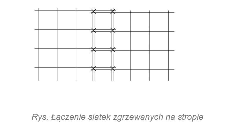 przez zazębienie lub przez nałożenie warstwami - jeżeli występują obciążenia zmęczeniowe (długotrwałe naprężenia zmienne), to należy stosować siatki łączone przez zazębienie. Połączenia siatek ułożonych w wielu warstwach powinny być przesunięte względem siebie o co najmniej 1,3*Lo