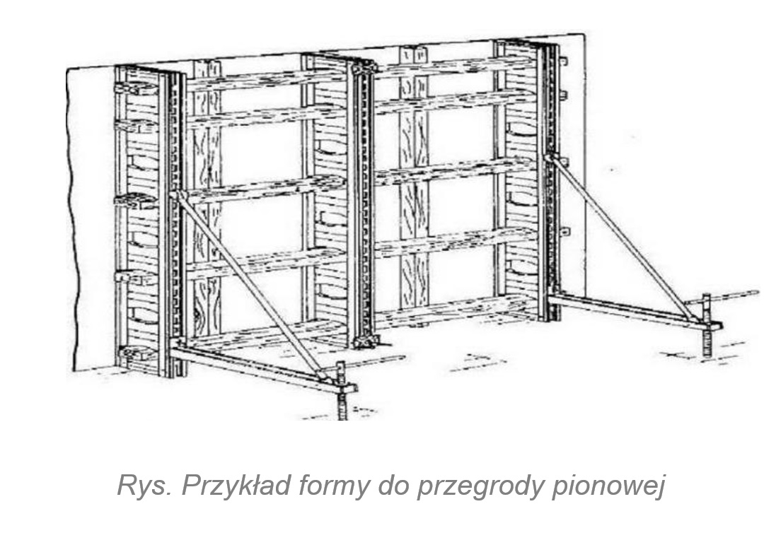 Przegrody pionowe ściany (ściany oporowe , fundamenty) mogą być betonowane w formach drobnowymiarowych lub większych, zestawianych w duże zespoły przy zastosowaniu odpowiednich stężeń i łączników.