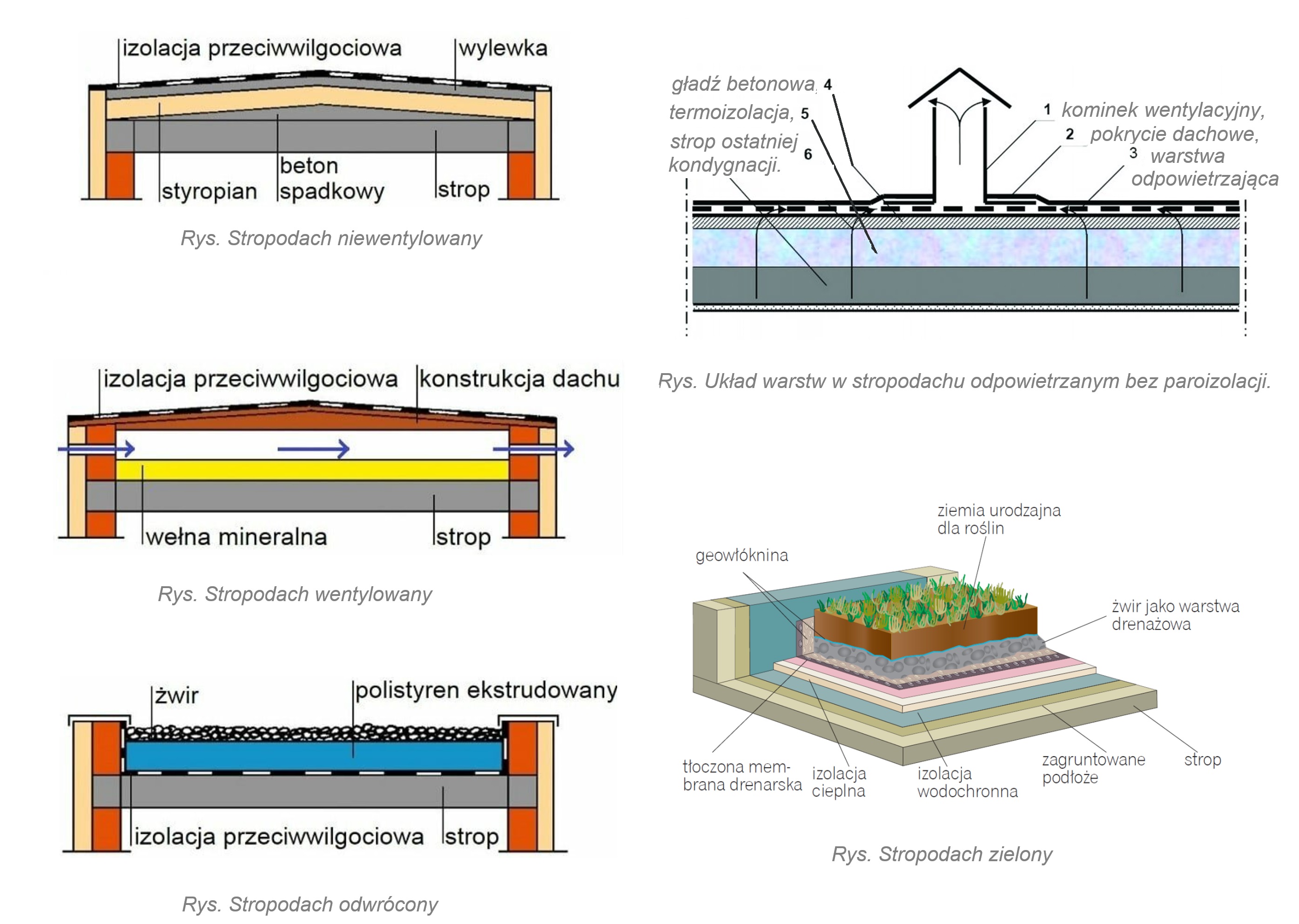 Istnieje wiele rozwiązań materiałowo-konstrukcyjnych stropodachów, pod względem budowy można je podzielić na następujące rodzaje: