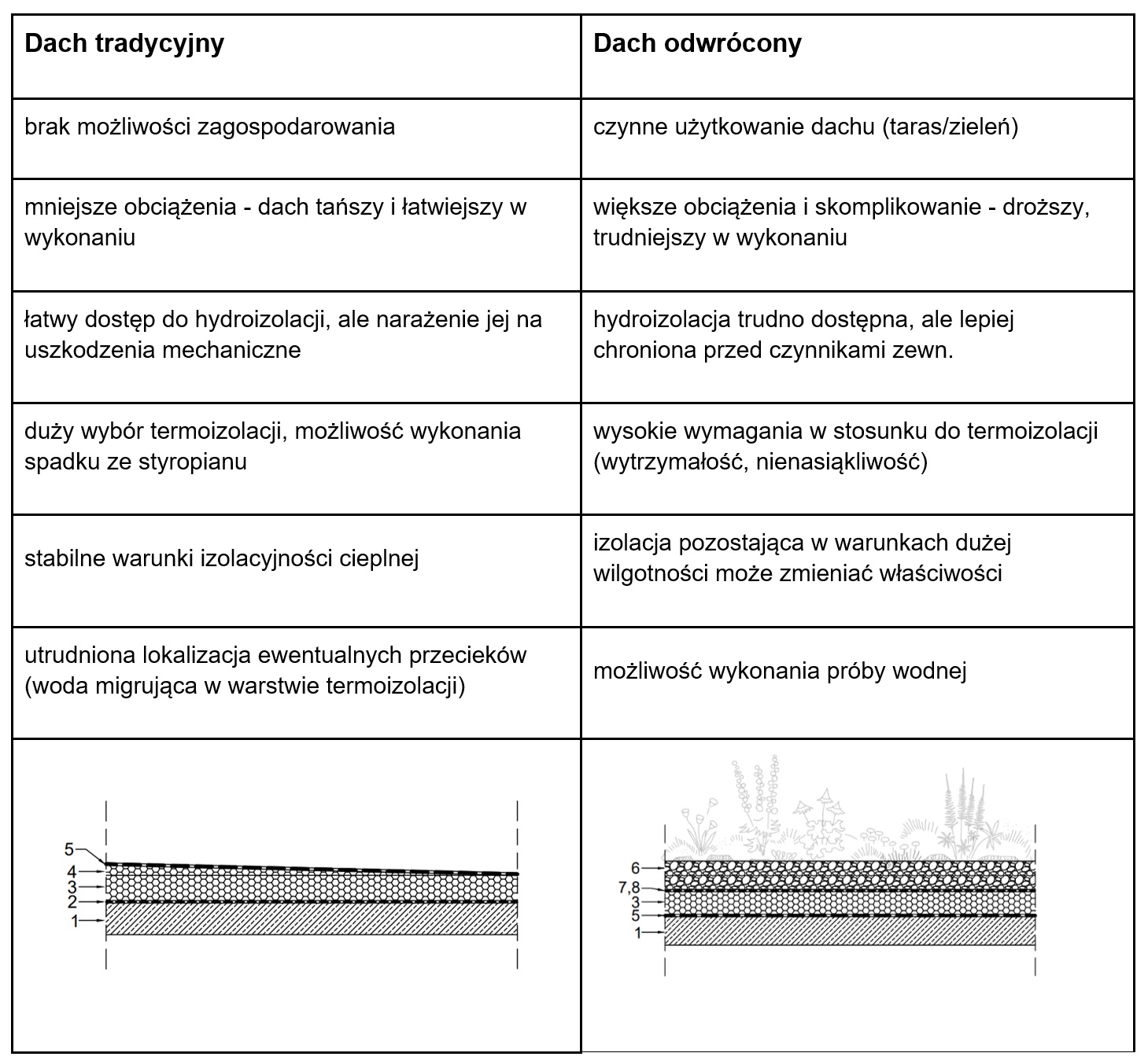 Dokonaj porównania dachu z układem tradycyjnym warstw i układem odwróconym.