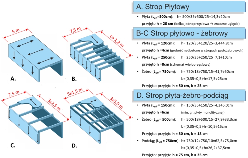 Poniżej przedstawione wzory dot. wstępnego doboru wstępnych przekrojów poprzecznych elementów żelbetowych stropów: