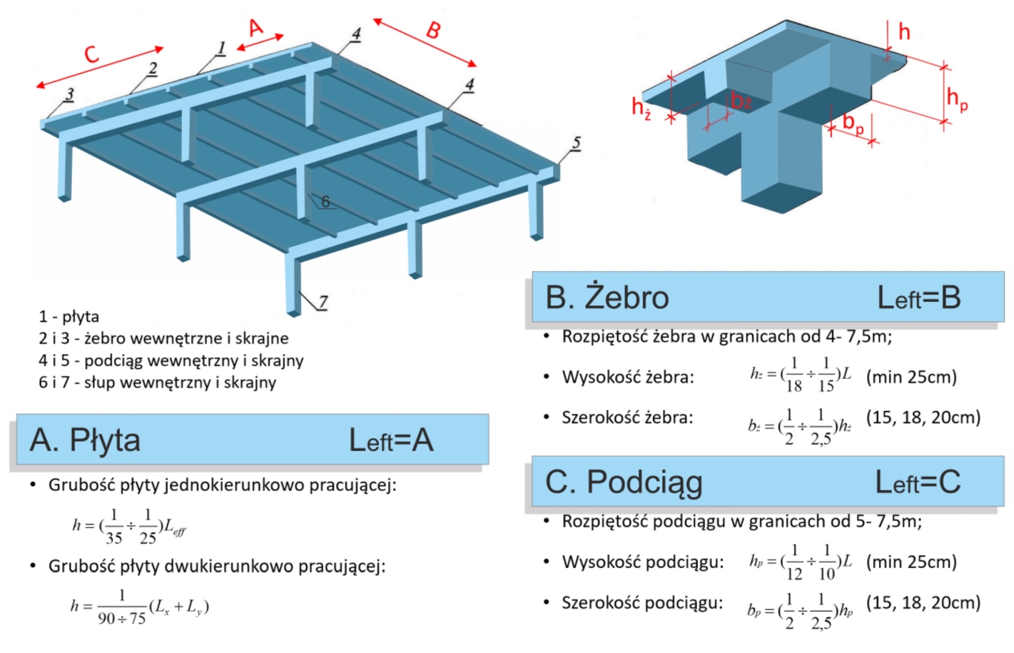 Poniżej przedstawione najważniejsze elementy stropu typu płyta-żebro-podciąg.