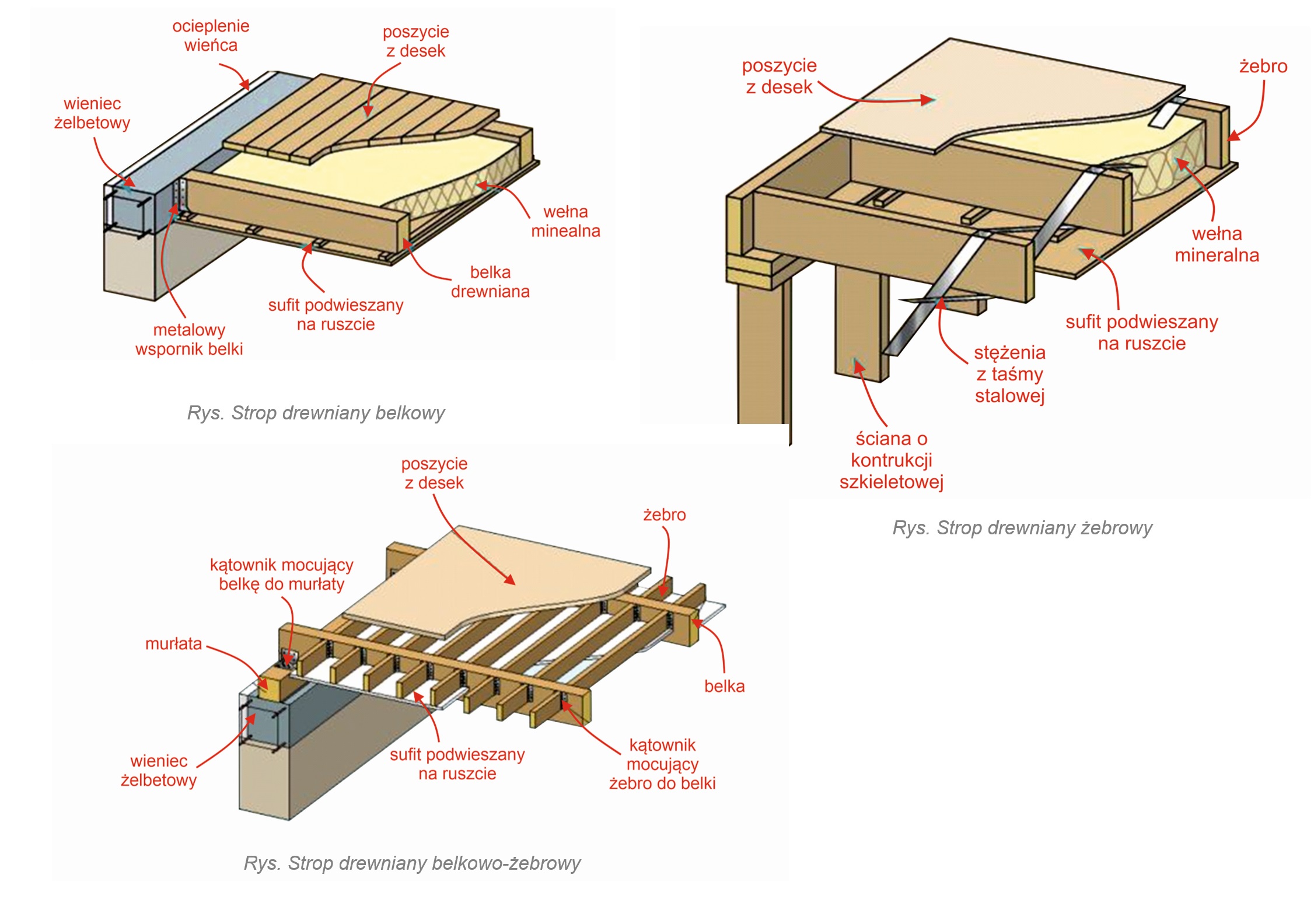 Stropy drewniane słabo izolują akustycznie, warto więc w nich stosować podwójną izolację akustyczną: pomiędzy belkami oraz w podłodze. Aby nie dopuścić do skrzypienia podłogi, płyty poszycia trzeba przykleić do belek lub oddzielić od nich podkładkami z filcu.