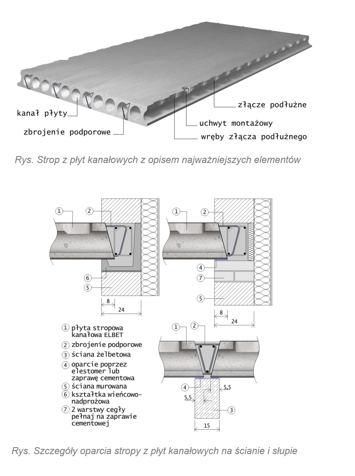 Płyty kanałowe to prefabrykaty żelbetowe z betonu klasy C20/25 bądź wyższej. Klasę betonu dobiera się w zależności od projektowanej rozpiętości stropu oraz obciążeń. Cechą rozpoznawczą płyt są okrągłe, puste kanały rozmieszczone wzdłuż prefabrykatu. Dzięki pustkom element jest znacznie lżejszy. Grubość płyt kanałowych to 22 - 26 cm, a maksymalna rozpiętość to 7,2 m. Długości płyt zmieniają się co 10 cm. Najczęściej stosuje się prefabrykaty o szerokości 90 - 160 cm. Podczas projektowania konstrukcji należy pamiętać o dodatkowym zbrojeniu, które układa się między płytami. Koniecznym elementem konstrukcji stropu kanałowego jest wieniec, który scali konstrukcję. Prefabrykaty układa się na sucho, opierając je bezpośrednio na ścianach. Minimalna głębokość oparcia płyt na murze wynosi 8 cm. Aby wyeliminować zjawisko klawiszowania stropu, przestrzenie między płytami wypełnia się mieszanką betonową z dodatkiem zwiększającym jej wytrzymałość i dokładnie zagęszcza buławą wibracyjną. Dzięki temu beton uzyskuje odpowiednią klasę wytrzymałości. Wieniec betonuje się w prefabrykowanych kształtach typu U lub L, w których umieszcza się zbrojenie.