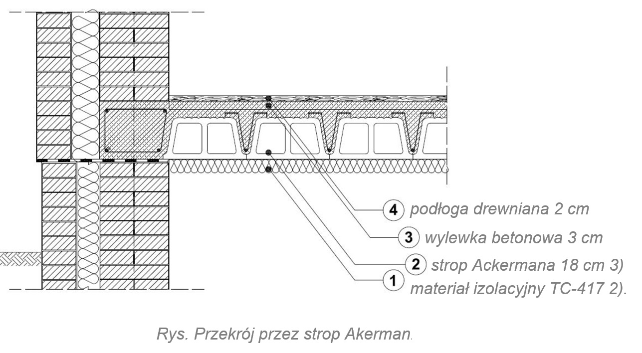 Strop Akerman - strop monolityczny z wypełnieniem pustakami ceramicznymi o wysokości 150, 180, 200, 220 mm; oraz długość 195 i 295 mm.