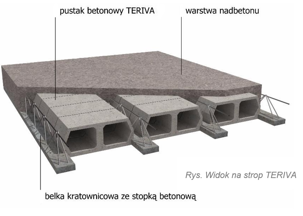 Stropy Teriva to stropy gęstożebrowe składające się z kratownicowych belek prefabrykowanych ze stopka betonowa, pustaków betonowych (z betonów lekkich) i betonu monolitycznego (nadbetonu).