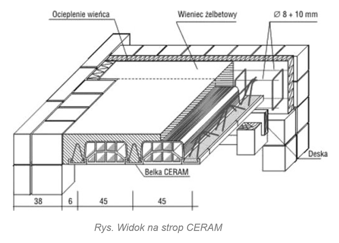 Rozstaw belek typu CERAM wynosi 45 cm. Belki składają się z dolnego pasa złożonego z kształtek ceramicznych szerokości 12 cm, wysokości 4 cm oraz zbrojenia złożonego z trzech stalowych prętów oraz strzemion ułożonych w formie kratownicy o przekroju trójkątnym. W przypadku rozpiętości stropu powyżej 4,2 m, dolna strefa rozciągana w belkach typu CERAM, wzmacniana jest dodatkowo jednym lub dwoma stalowymi prętami.