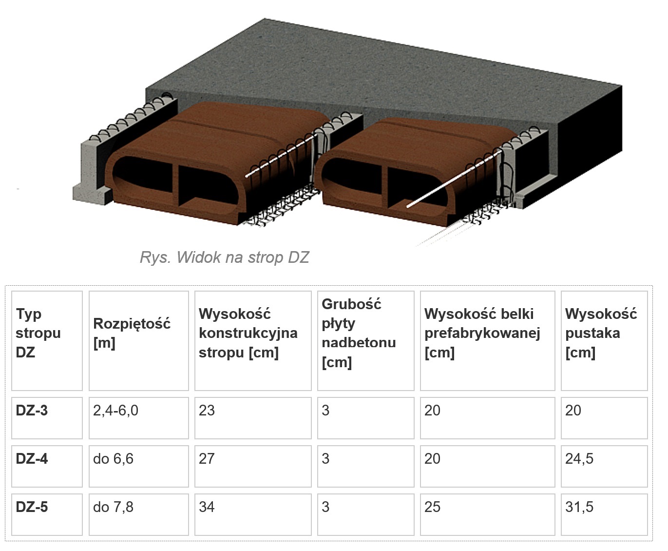 Rozróżnia się trzy typy stropu DZ: DZ-3; DZ-4; DZ-5.
