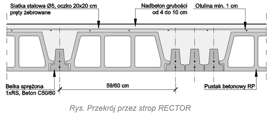 Stropy RECTOR składają się ze strunobetonowych belek stropowych oraz wypełnień w postaci żwirobetonowych, wibroprasowanych pustaków. Uzupełnieniem systemu są: zbrojenia przypodporowe, zgrzewane maty siatki stalowej oraz beton monolityczny wylewany na budowie.