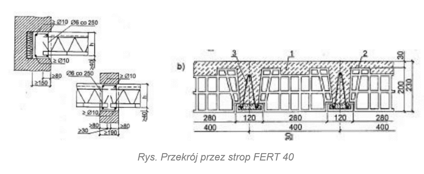 Składają się z prefabrykowanych belek ceramiczno-żelbetowych, pustaków ceramicznych i wylewanej płyty nadbetonu. Spotyka się 3 rodzaje stropów Fert: 40, 45, 60 (liczby równe rozstawowi osiowemu żeber). Belki prefabrykowane typu Fert stanowiące po zabetonowaniu żebro konstrukcyjne stropu, składają się z dolnego pasa złożonego z kształtek ceramicznych szerokości 12 cm, wysokości 4 cm i długości 25 cm, zbrojenia złożonego z trzech prętów stalowych, z których dwa znajdują się w pasie dolnym i jeden w pasie górnym oraz strzemion ze stali o średnicy 4,5 mm ułożonych w formie kratownicy o przekroju trójkątnym i łączących zbrojenie górne ze zbrojeniem dolnym. Dolną stopkę żebra stanowi kształtka ceramiczna wypełniona betonem klasy B20. Górną część żebra i płytę betonuje się po ułożeniu belek i pustaków betonem klasy B15.