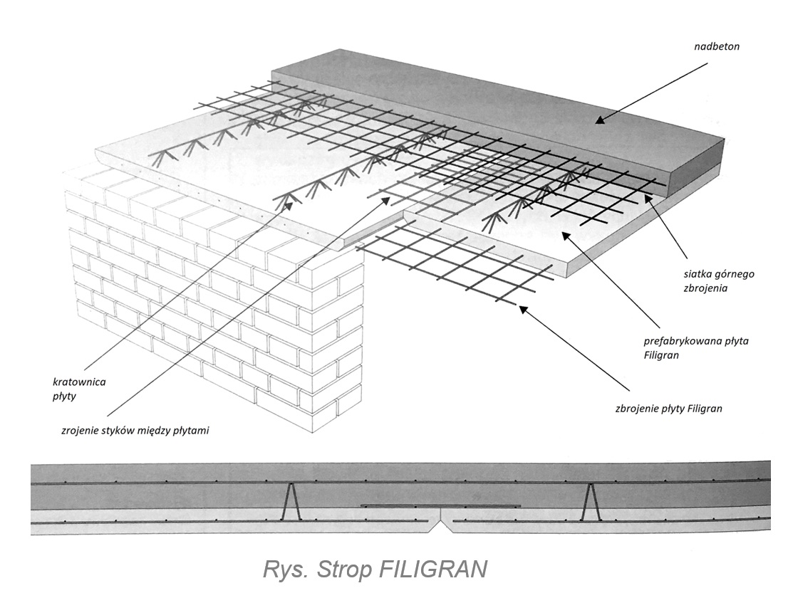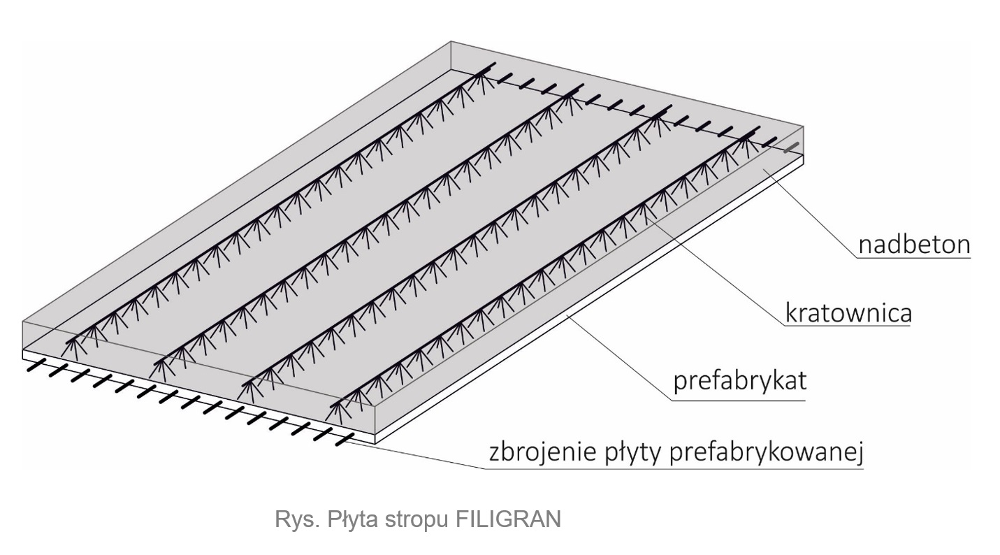 Przygotowywane w zakładzie produkcyjnym prefabrykowane cienkie płyty żelbetowe, będące częścią zespolonego stropu żelbetowego, mają grubość 4,5 - 7 cm. Zbrojone są stalowymi kratownicami przestrzennymi oraz dodatkowymi prętami układanymi równolegle oraz prostopadle do kratownic. Ze względów konstrukcyjnych (grubość płyty oraz wysokość dźwigarów kratowych) całkowita wysokość stropu Filigran łącznie z warstwą nadbetonu nie może być mniejsza niż 12 cm. Kratownice stalowe usytuowane są równolegle do dłuższego boku płyty stropowej w rozstawie nie większym niż 0,75 m. W monolitycznej warstwie betonu - na budowie - układa się zbrojenie dodatkowe, na przykład zbrojenie przy podporze. Zespolenie dwóch warstw stropu Filigran - prefabrykowanej i monolitycznej - zapewniają częściowo zabetonowane w stropie stalowe kratownice przestrzenne oraz chropowata powierzchnia płyt prefabrykowanych.