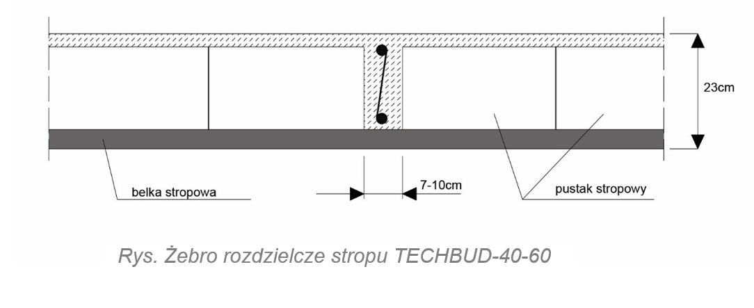 W stropach o rozpiętości powyżej 4,0 m należy stosować żebra rozdzielcze. Jeżeli rozpiętość stropu jest mniejsza niż 6,0 m stosuje się co najmniej jedno żebro rozdzielcze zaprojektowane w pobliżu środka rozpiętości stropu. Przy rozpiętości stropu większej niż 6,0 m stosuje się co najmniej dwa żebra rozdzielcze, przy czym odległość między podporami stałymi i żebrami oraz między żebrami powinna wynosić około 1/3 rozpiętości stropu. Szerokość żebra rozdzielczego powinna wynosić 70 ÷100 mm, a wysokość powinna być równa wysokości stropu.