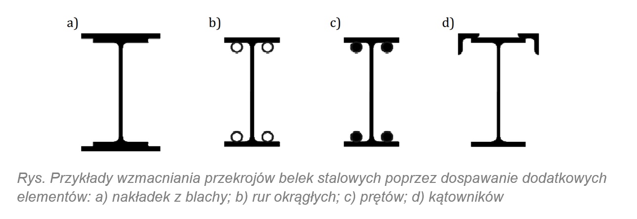 Najczęściej stosowanym rozwiązaniem w zakresie wzmacniania stalowych belek stropowych jest zwiększenie (rozbudowanie) ich przekroju poprzecznego poprzez dospawanie elementów wzmacniających - kształtowników walcowanych (kątowników, ceowników itp.), rur, prętów stalowych lub nakładek z blachy. Najlepszy efekt wzmocnienia przekrojów zginanych uzyskuje się w przypadku maksymalnego oddalenia od osi obojętnej dospawanych elementów wzmacniających - następuje wtedy największy przyrost momentu bezwładności przekroju, a także wskaźnika wytrzymałości na zginanie. Ten typ wzmacniania powoduje konieczność wykonania spoin na budowie, co jest procesem pracochłonnym, często wymaga również dostępu do górnej półki belki stalowej, co może powodować konieczność demontażu płyty stropowej.