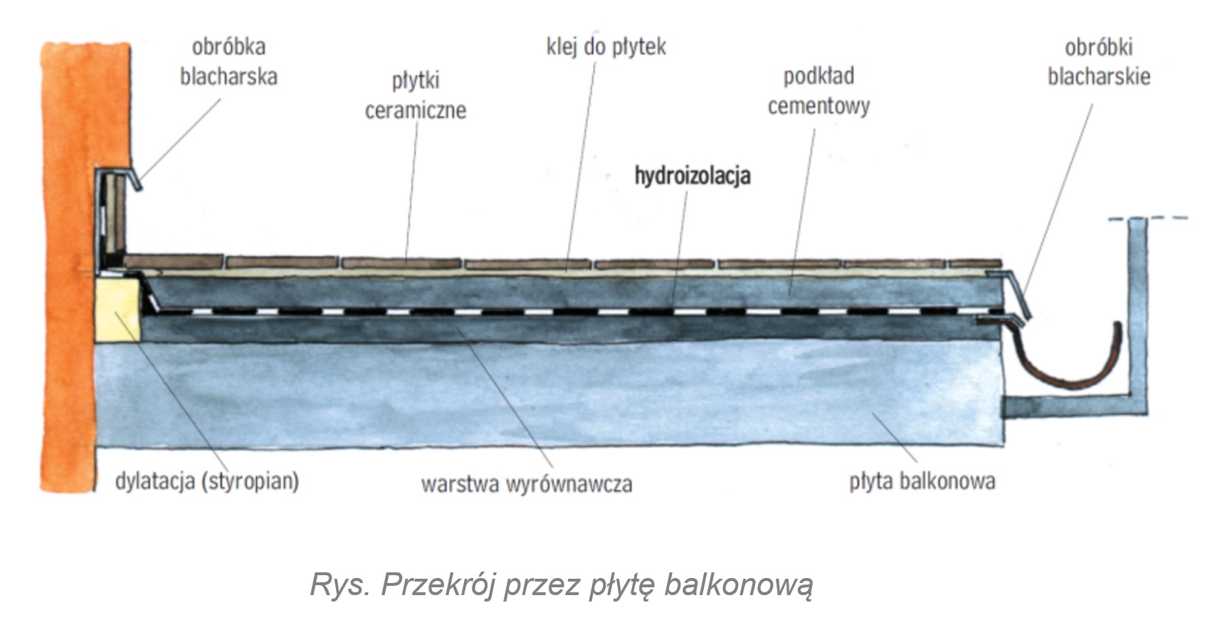 Podczas kształtowania balkonów wspornikowych w celu wyeliminowania możliwości przedostawania się wody opadowej do przyległych pomieszczeń poziom posadzki balkonu powinien być niższy od poziomu posadzki wnętrza o około 5,0 cm. Dodatkowo, aby umożliwić odprowadzenie wody deszczowej z powierzchni balkonu, należy skonstruować go ze spadkiem 1,0÷2,0% w stronę części zewnętrznej.