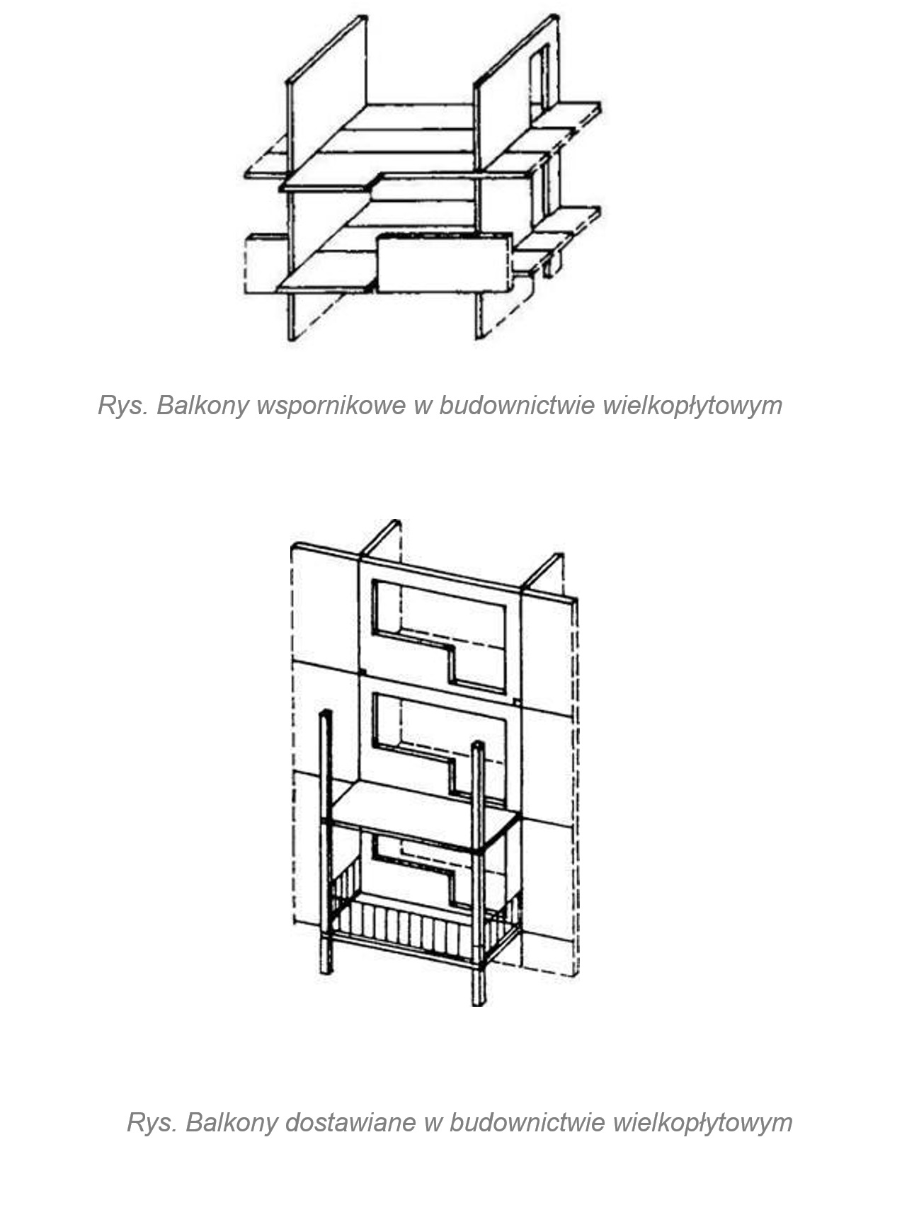 Balkony wspornikowe o wysięgu 0,90 - 1,10 m stanowią najliczniejszą grupę rozwiązań spotykanych w budynkach. Mogą występować balkony krótkie o szerokości do około 1,5 m i balkony długie o szerokości równej rozpiętości płyt stropowych. W początkowym okresie realizacji budynków wielkopłytowych stosowane były skrajne płyty stropowe, wykonane monolitycznie z balkonową częścią wspornikową. W celu ograniczenia wpływu mostków termicznych rozwiązanie to zmodyfikowano, wykonując monolityczne połączenie między podestem balkonowym a płytą stropową za pomocą żeber, pomiędzy którymi umieszczono warstwę termoizolacyjną.