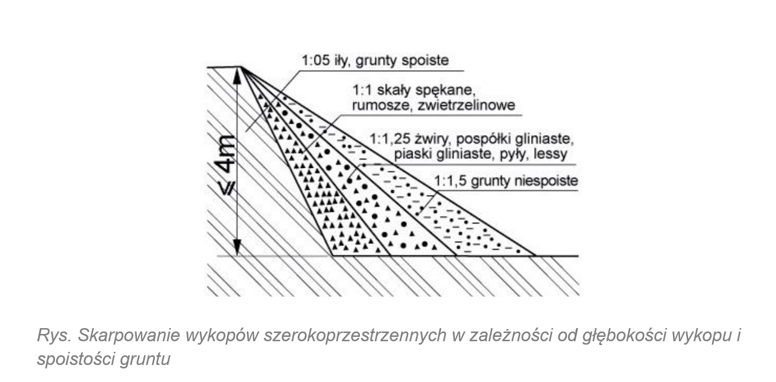 W przypadku przekroczenia podanych wyżej głębokości wykopu szerokoprzestrzennego, lecz nie więcej niż do 4 m, należy stosować bezpieczne nachylenie skarp.