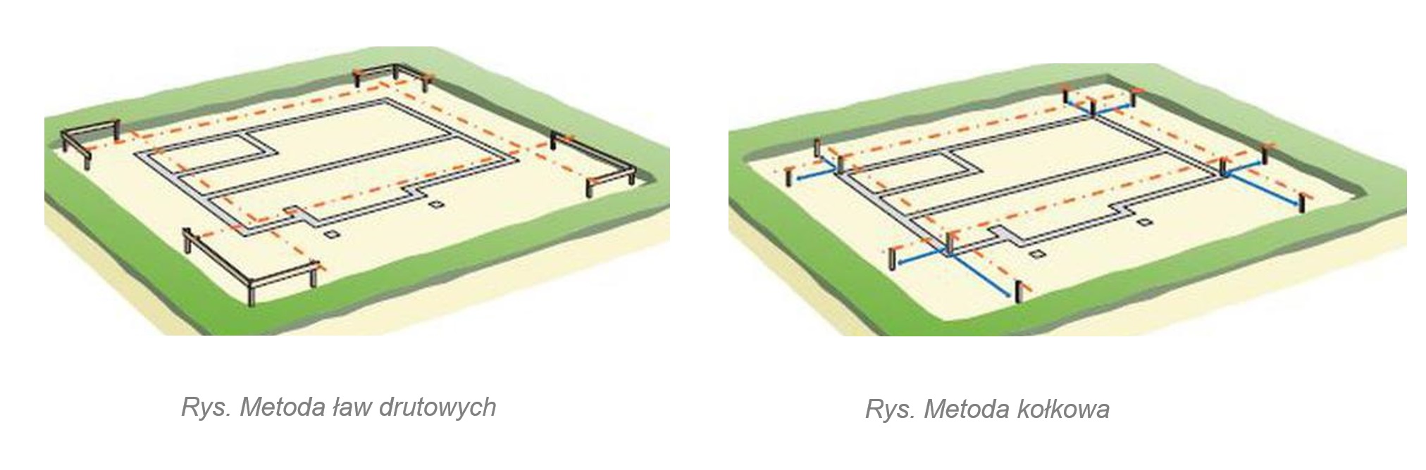 Przed rozpoczęciem prac ziemnych, należy wytyczyć miejsce, w którym budynek. Rozróżniamy dwie metody:
