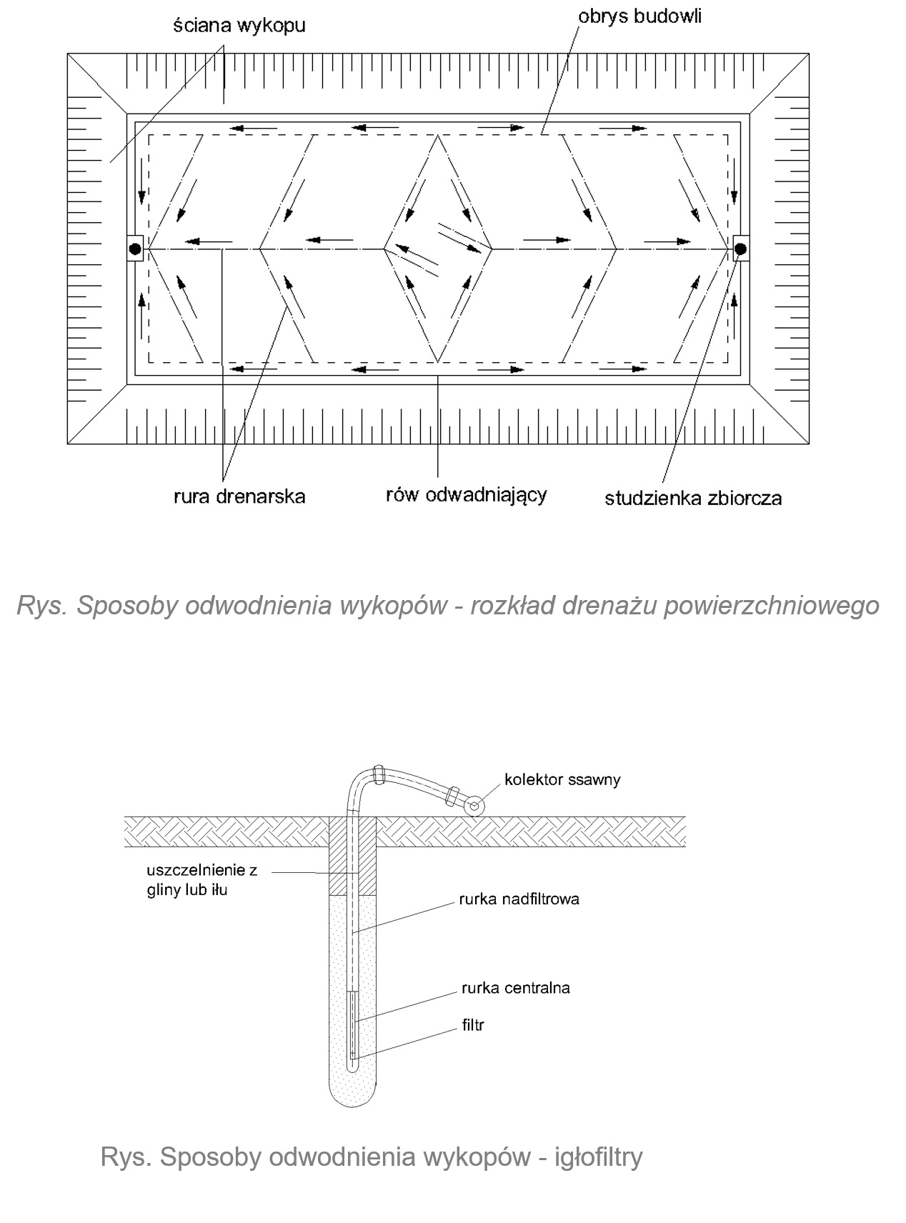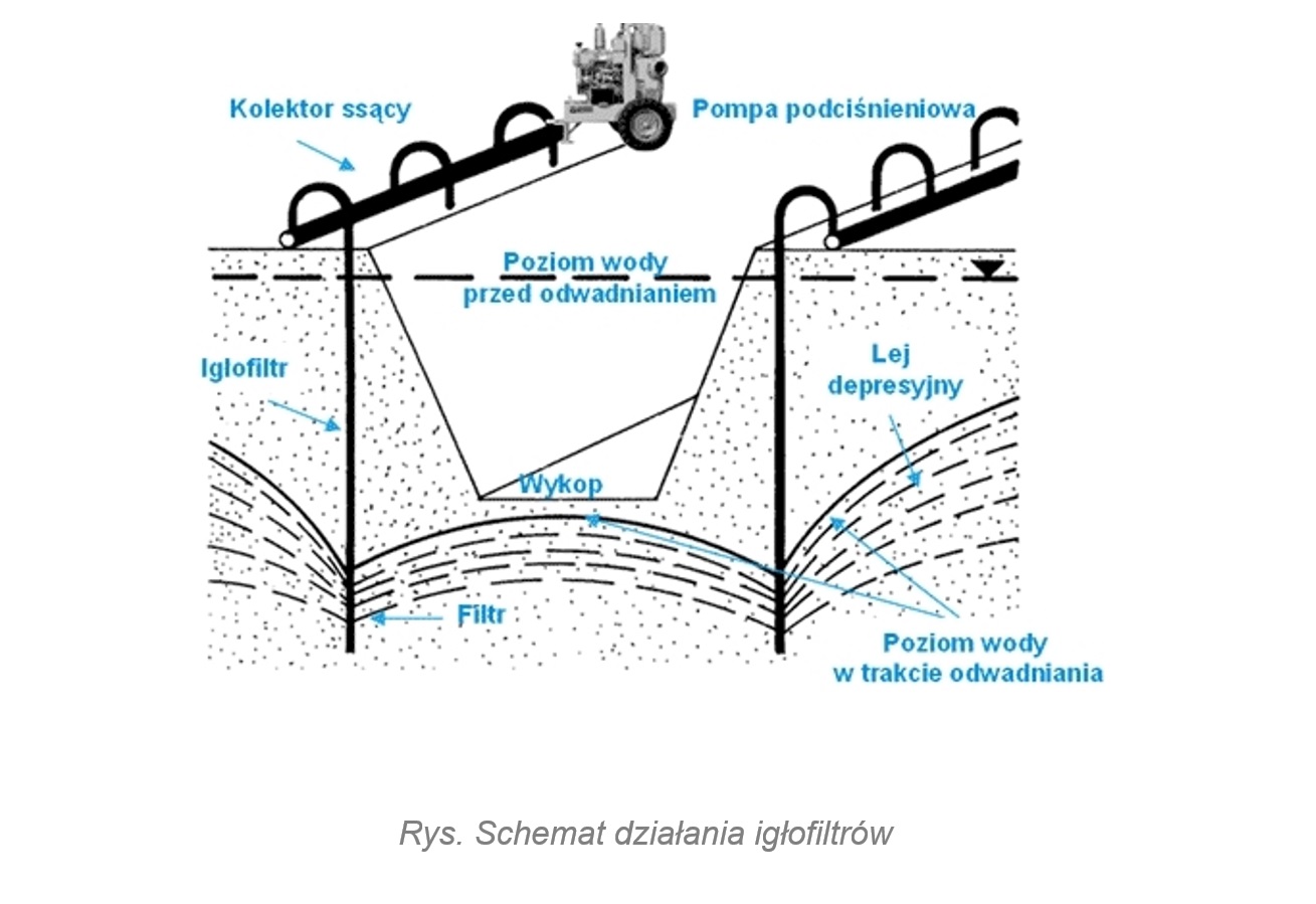Najpopularniejszym rozwiązaniem odwadniania wgłębnego są igłofiltry. Są to cienkie struktury wpłukiwane w grunt, rozmieszczane w regularnych odstępach, odbierające wodę na pewnej głębokości i przekazujące ją do kolektorów. Schemat zamontowanego rozwiązania tego rodzaju przedstawia grafika poniżej