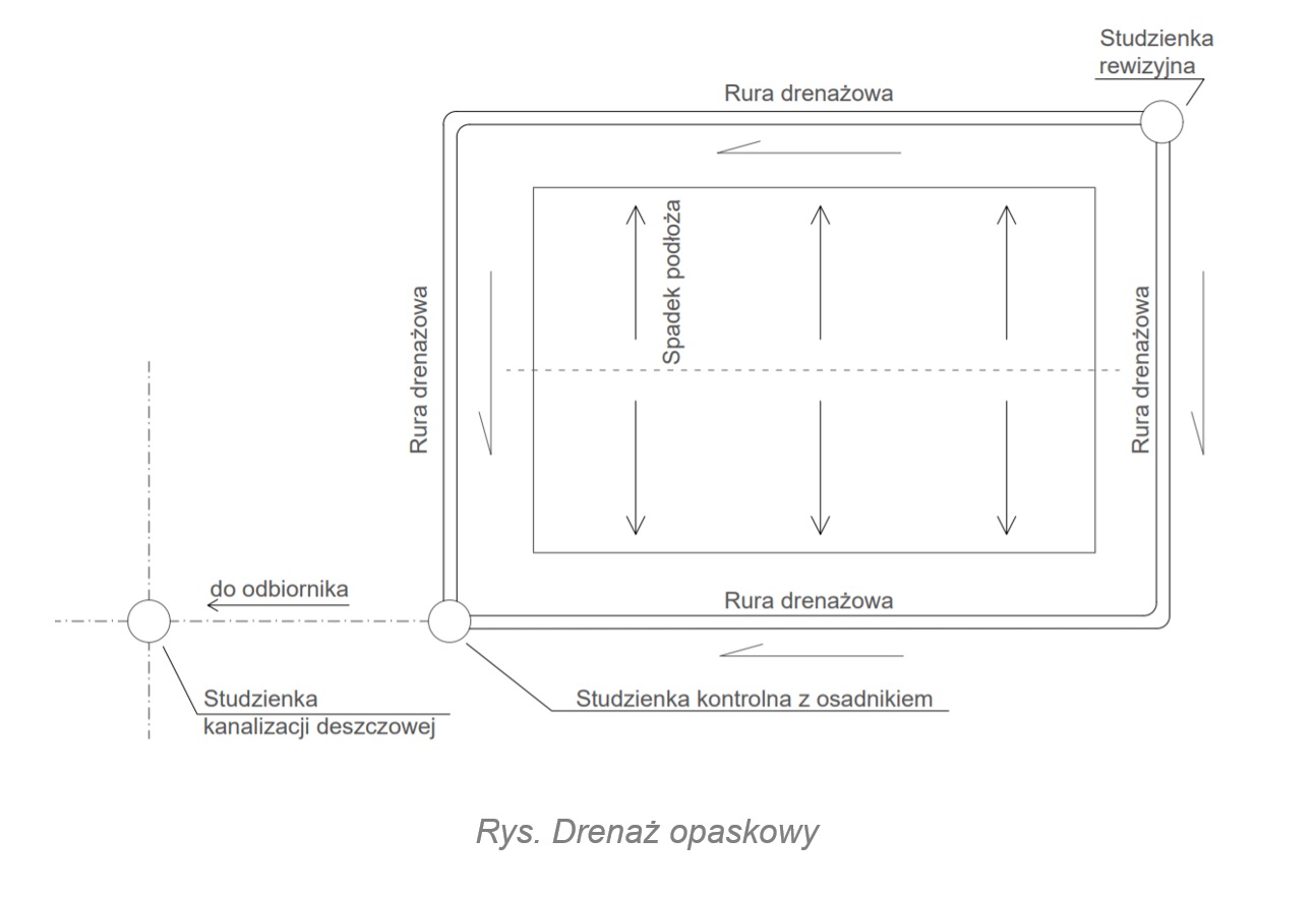 Układać je należy poniżej strefy przemarzania (1,10 - 1,20 m). Studzienki w narożnikach, studzienka rewizyjna po przekątnej do studzienki zbiorczej. Przyłączenie drenażu do kanalizacji ogólnospławnej czy deszczowej wymaga zabezpieczenia przed dostaniem się mułu do kanalizacji oraz ścieków do gruntu.