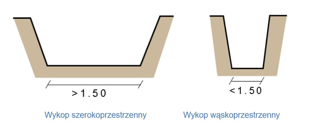 - wykopy - wolna przestrzeń, która powstaje po usunięciu gruntu, wykopy mogą być szerokoprzestrzenne (szerokość>1.5m,), wąsko przestrzenne(szerokość <1.5m), jamiste (szerokość i długość <1.5m)