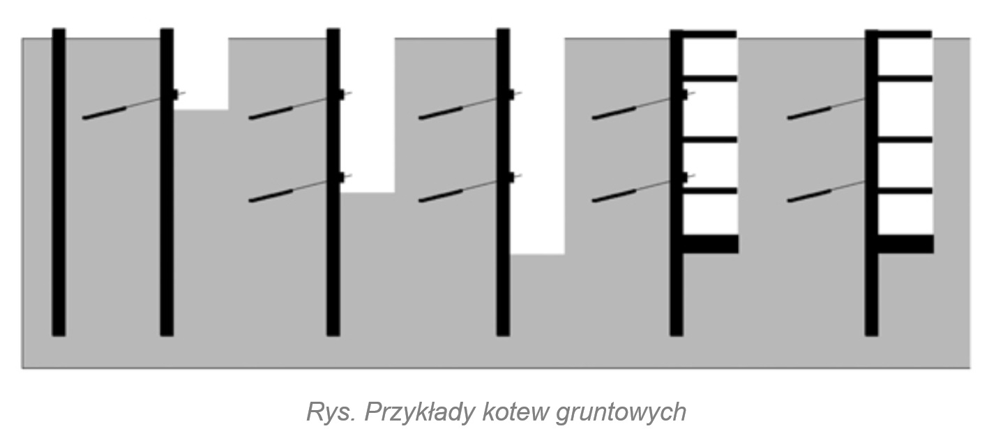 Kotwy gruntowe - są elementami przenoszącymi siły rozciągające na nośną warstwę gruntu. Kotew gruntowa składa się z głowicy, swobodnego odcinka cięgna oraz buławy. Buława jest częścią kotwy zlokalizowaną w gruncie nośnym i zespoloną z nim stwardniałą zawiesiną cementową.