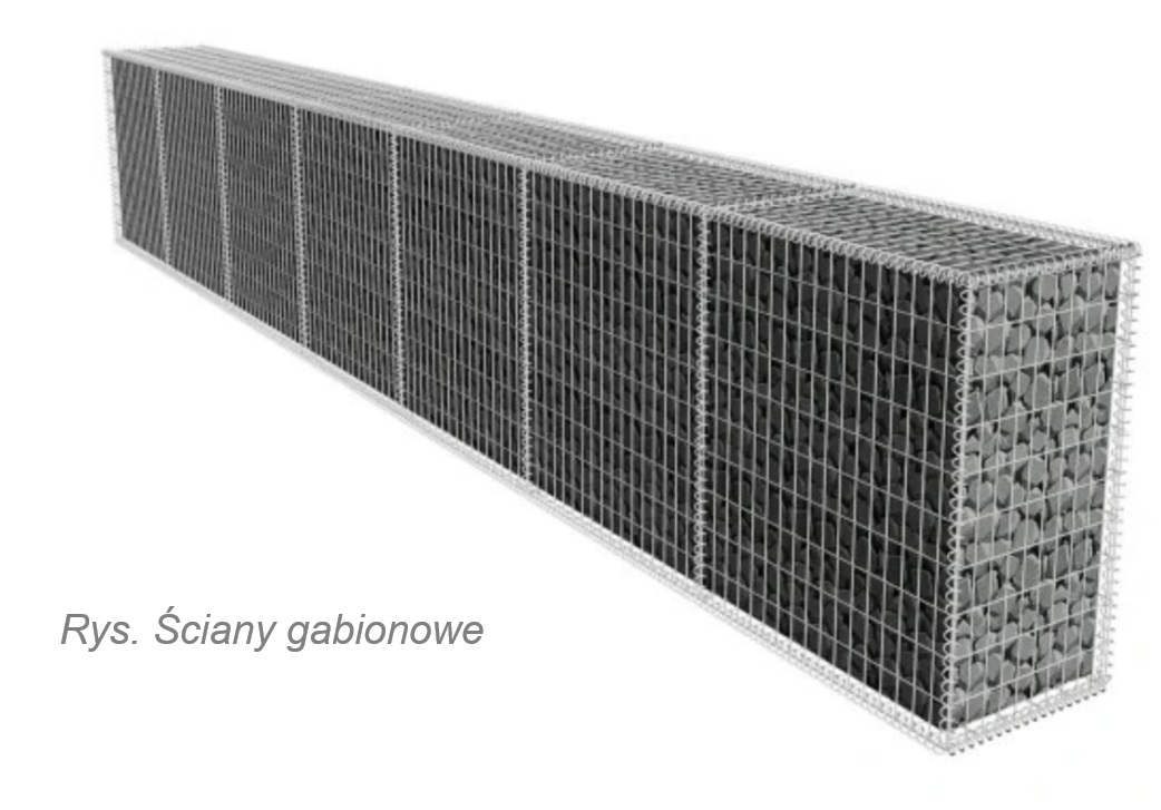 Ściany gabionowe - są prostopadłościennymi koszami, wykonanymi z podwójnie skręconej siatki stalowej galwanizowanej cynkiem lub cynkiem i aluminium .Gabiony dostarcza się na budowę całkowicie gotowe i złożone na płask na czas transportu. W miejscu wbudowania wypełnia się je otoczakami, kamieniami łamanymi lub innym kruszywem. Siatki produkuje się i formuje w elementy skrzyń lub walców metodami przemysłowymi. Kosze, walce i materace różnią się między sobą kształtem koszy (wysokością, długością i szerokością).