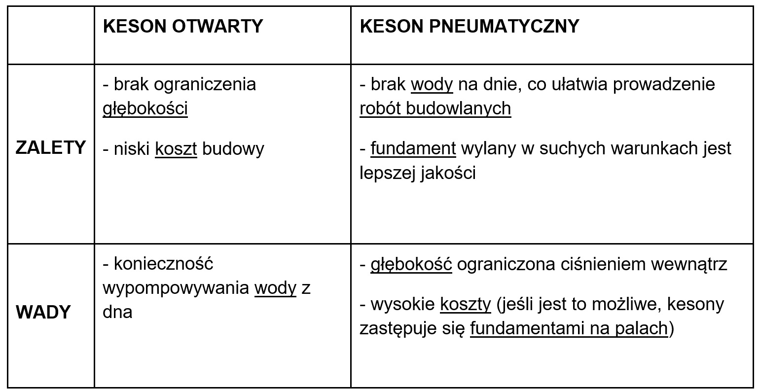 - głębokość ograniczona ciśnieniem wewnątrz - wysokie koszty (jeśli jest to możliwe, kesony zastępuje się fundamentami na palach) |